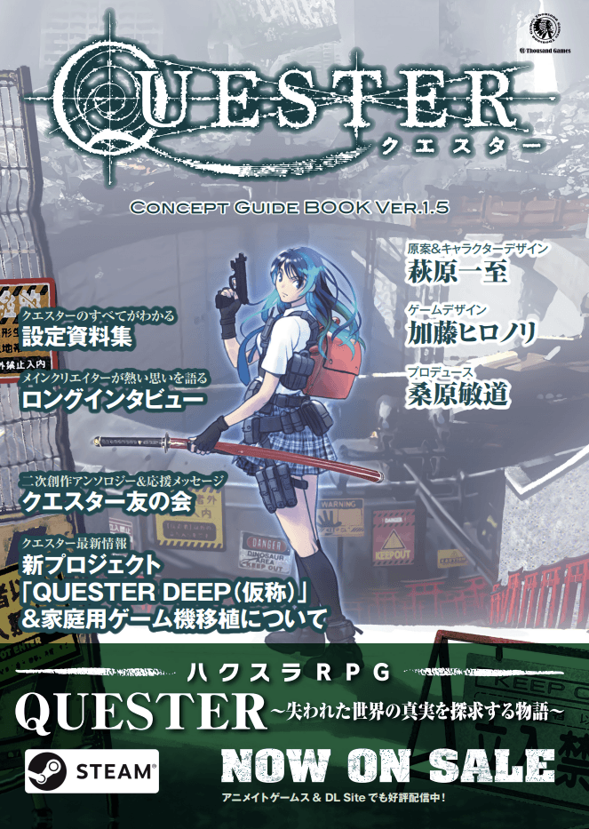 出展期間中、会場では試遊特典として『QUESTER コンセプトガイドブック Ver.1.5』を配布します。48ページのフルカラー小冊子には、メインスタッフ(萩原一至・加藤ヒロノリ・桑原敏道)のインタビューや設定資料、新プロジェクト『QUESTER DEEP』(仮称)の最新情報などが掲載されています。