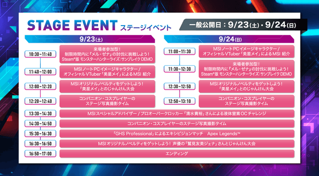 また、9月23日と24日の一般公開日には、ゲームプレイイベントやプロゲーマーによるエキシビジョンマッチ、液体窒素を用いたエクストリームオーバークロックチャレンジなど、インフルエンサーと来場者が参加可能なステージイベントが予定されています。さらに、MSIのオリジナルノベルティをゲットできるじゃんけん大会やコスプレイベントも開催予定です。