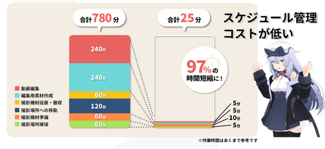 「VARK SHORTS Corporate Plan」は、3Dアバターと専用のメタバーステンプレートを活用することで、動画投稿に必要な撮影場所や撮影準備、撮影人員の確保、編集などの各工程にかかる工数を最大97%削減できます。また、「VARK SHORTS専用メタバーステンプレート」は、そのまま使っても動画として投稿可能で、ネタ探しに困った時にも役立ちます。さらに、自社キャラクターや3Dアバターを持っていない企業に対しても、無料または低コストでの3Dアバター制作をサポートします。