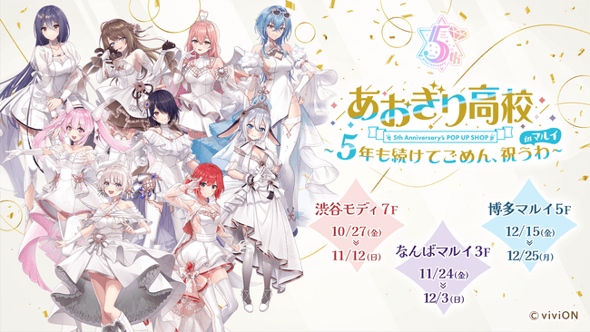VTuberプロダクション『あおぎり高校』が、2023年10月27日に活動5周年を迎えることを記念し、渋谷、なんば、博多のマルイ店舗でコラボレーションイベント『「あおぎり高校」5th Anniversary’s POP UP SHOP~5年も続けてごめん、祝うわ~ inマルイ』を開催します。
