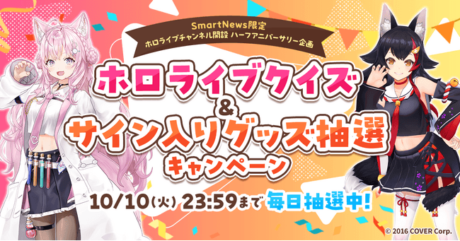 SmartNews、「ホロライブチャンネル」にて、人気VTuber大神ミオさん、博衣こよりさんを公式リポーターに迎えたスペシャル企画「ホロライブクイズ」を開催