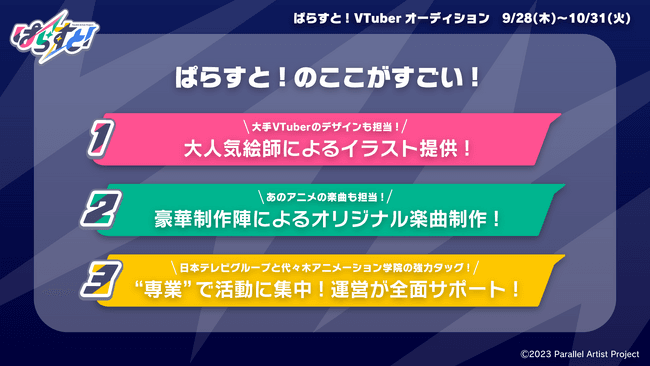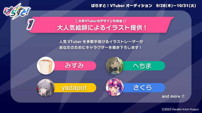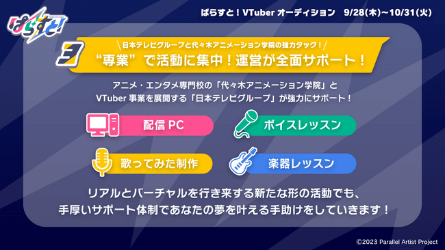 キャラクターデザインは人気VTuberを手掛けるイラストレーターが担当し、オリジナル楽曲はアニメ主題歌を担当する豪華なクリエイター陣が書き下ろします。芸能活動に必要なスキルについては、代々木アニメーション学院が強力にサポートします。