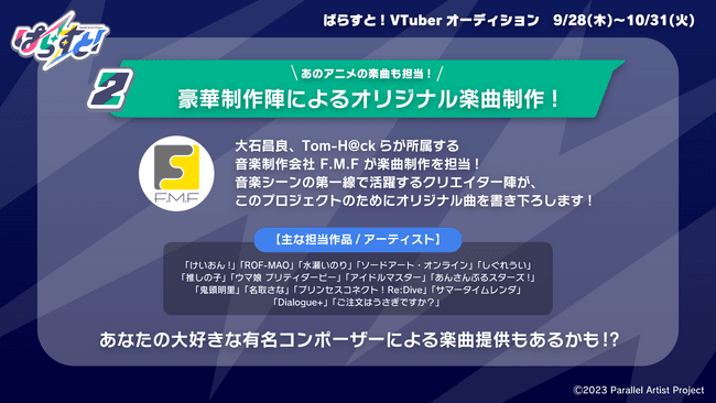 オーディションへの参加は配信業経験者も未経験者も可能です。また、音楽制作会社F.M.Fが楽曲制作を担当します。