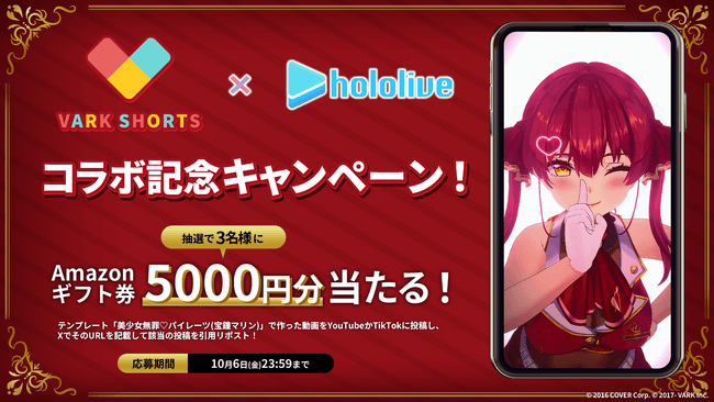 エンターテイメントサービスを展開する株式会社VARK(代表取締役:加藤卓也)は、VRM形式のアバターでショート動画が作成できる「VARK SHORTS」に、女性VTuberグループ「ホロライブ」の「宝鐘マリン」のコラボテンプレート「美少女無罪♡パイレーツ(宝鐘マリン)」を追加しました。追加日は9/29(金)です。