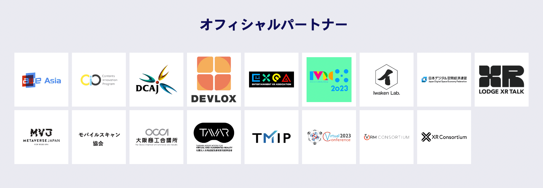 XR Kaigi 2023では、オフィシャルパートナーとして、業界で活動する団体やコミュニティと連携し、イベントを盛り上げてまいります。オフィシャルパートナーの一部はエキスポでの出展、セッションでの登壇を予定しています。