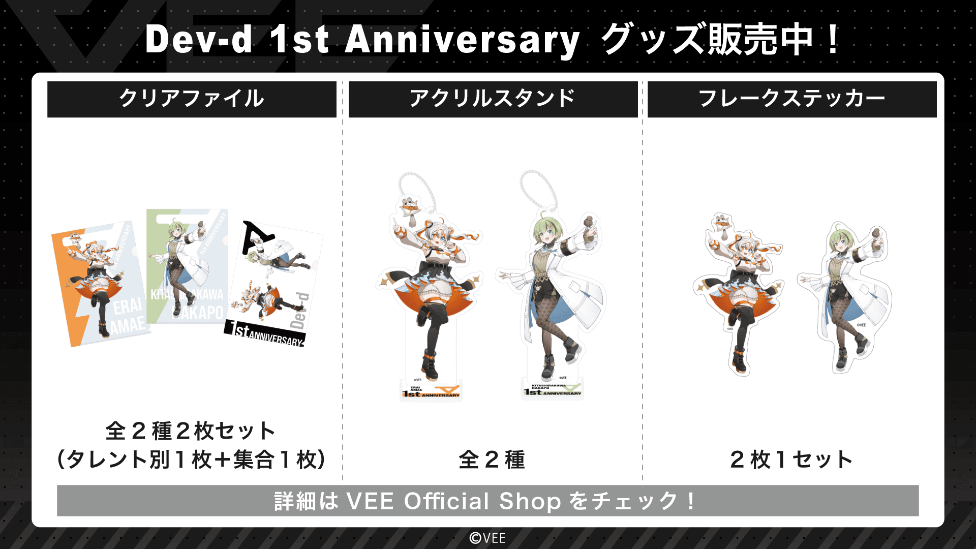 Dev-d(偉雷アマエ、北白川かかぽ)のデビュー1周年を記念した「1st Anniversary グッズ」の販売が、本日10月24日よりVEE Official Shopにて開始されました。
