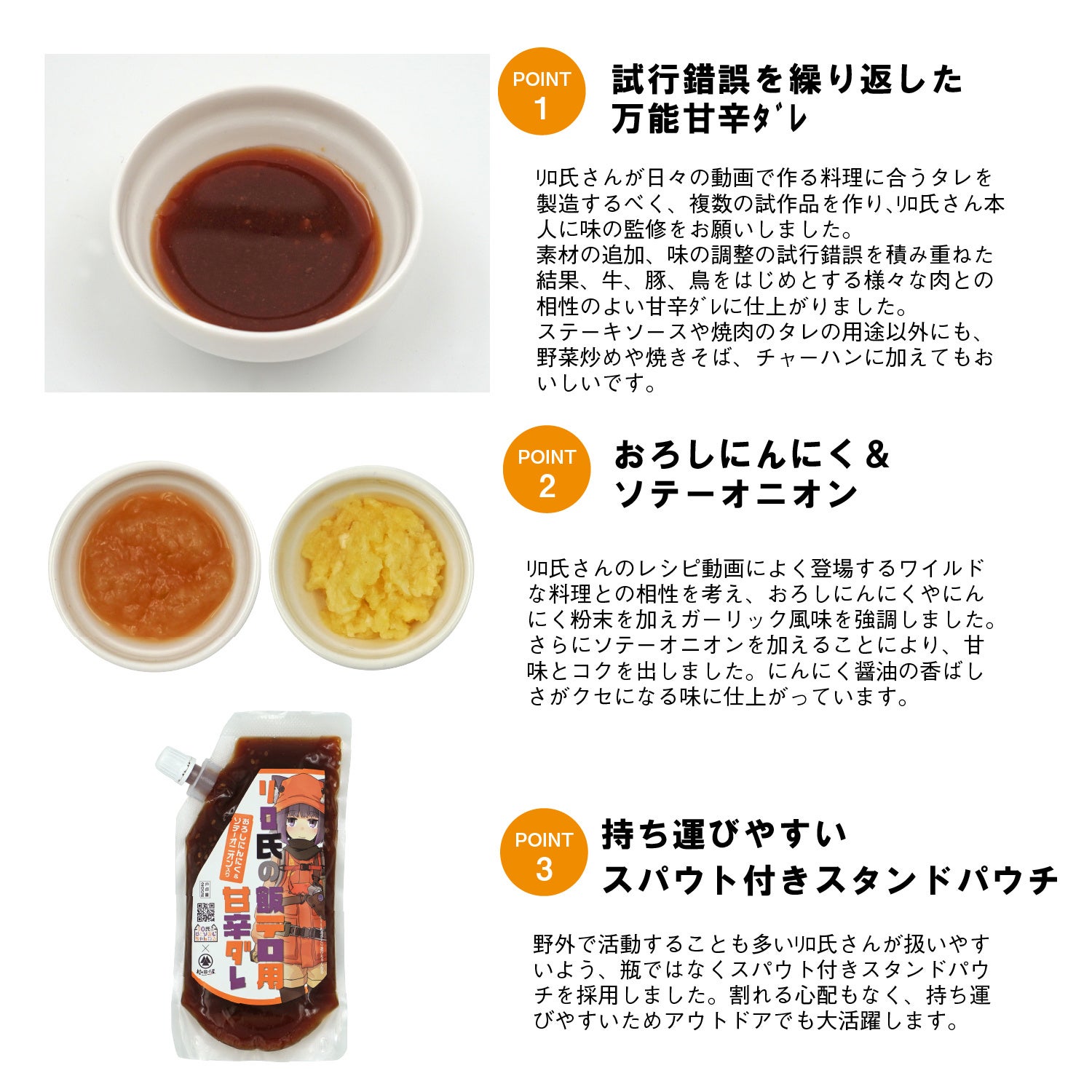 新商品の甘辛ダレは、リロ氏さんのレシピに合うよう開発されました。おろしにんにくとソテーオニオンを使用し、にんにく醤油の香りが特徴です。肉類はもちろん、野菜炒めや焼きそばなど様々な料理と合います。