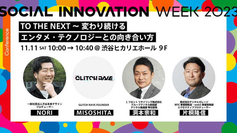 また、GLITCH RAVEプロジェクトのファウンダーMISOSHITAは新会社「株式会社GLITCHRAVE」を設立。同社ではGLITCH RAVEの他、オリジナルコンテンツやメタバース開発も手掛けます。MISOSHITAは11月11日のSIW2023と11月15日のInter BEE2023でGLITCH RAVEについて登壇予定です。