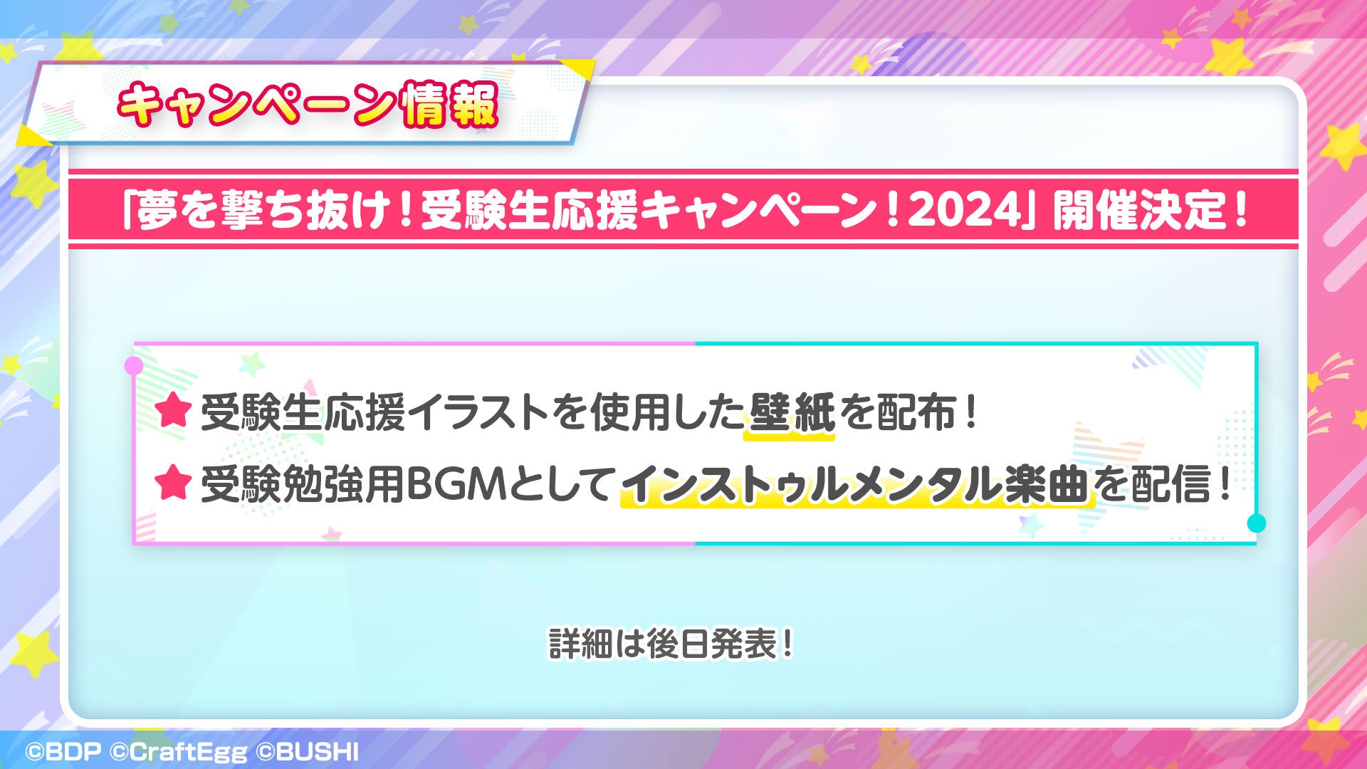 イラストと音楽で受験生を応援する「夢を撃ち抜け!受験生応援キャンペーン!2024」を開催することが決定いたしました。本キャンペーンでは、各音楽配信サービスにてガルパのインストゥルメンタル楽曲を配信するほか、描き下ろしイラストを使用した「応援壁紙」を配布いたします。