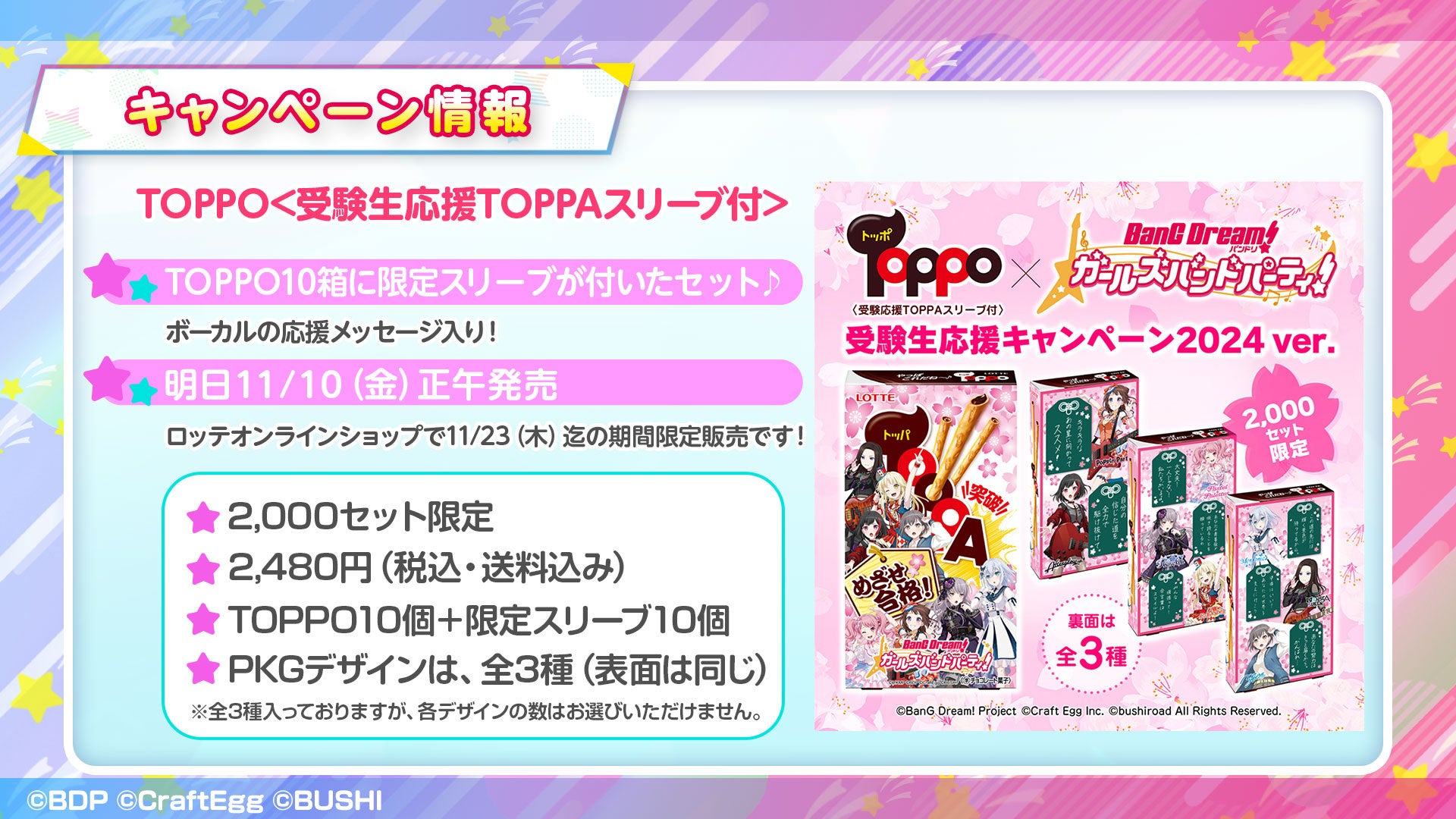 また、ガルパと「トッポ」のコラボレーション企画を実施いたします。コラボ商品として、「トッポ」10箱に限定スリーブがセットになった「トッポ<受験応援TOPPAスリーブ付>バンドリ! ガールズバンドパーティ! 受験生応援キャンペーン2024ver.」を、ロッテオンラインショップにて2023年11月10日(金)正午ごろより販売いたします。詳細はロッテオンラインショップをご確認ください。