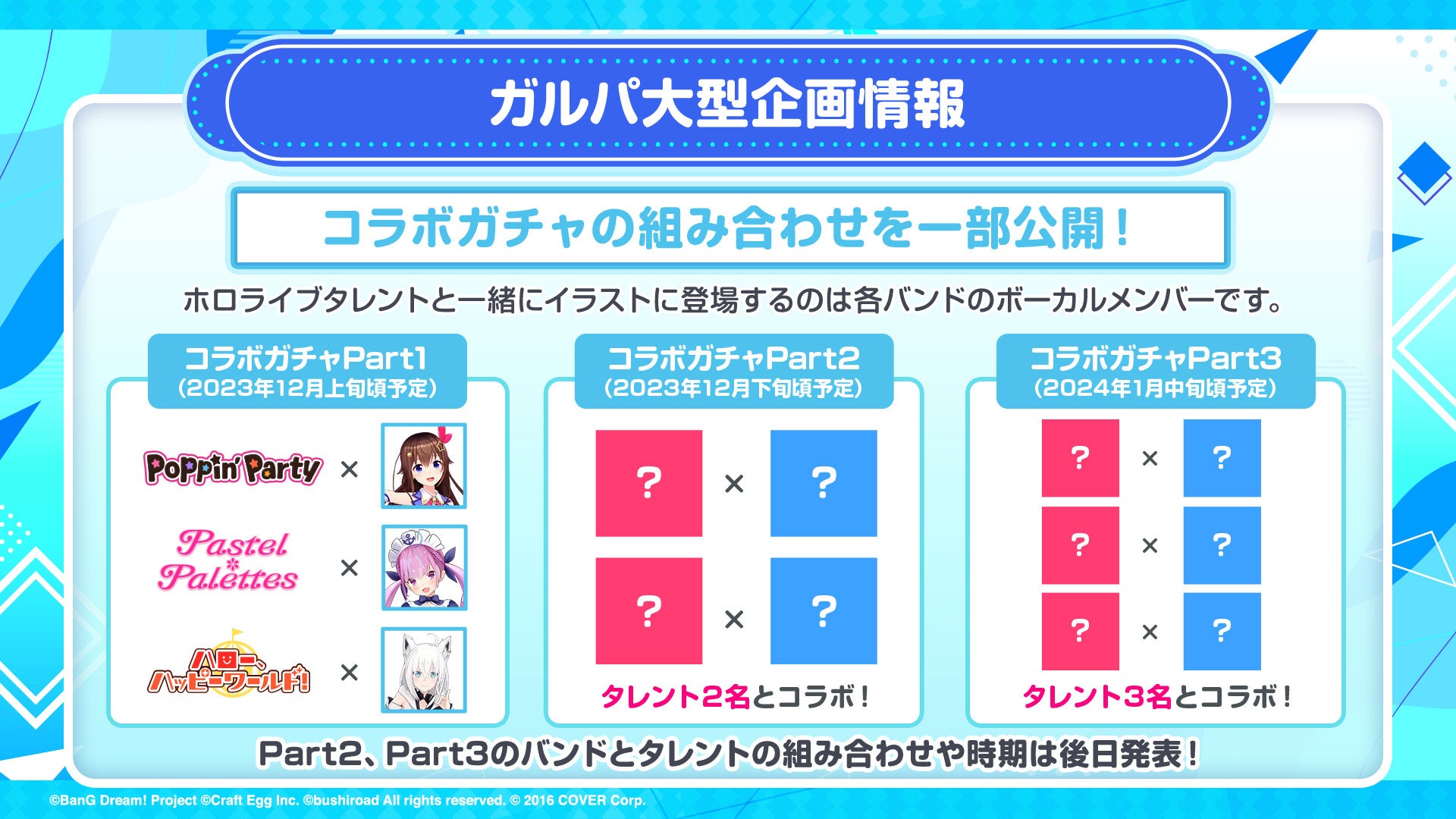 各バンドとコラボするタレントの組み合わせを一部公開いたしました。「第2弾ガルパ×ホロライブコラボ Part1」の組み合わせは、「Poppin’Party✕ときのそら」「Pastel*Palettes✕湊あくあ」「ハロー、ハッピーワールド!✕白上フブキ」となっております。Part2、Part3の組み合わせなどの詳細は後日発表いたします。