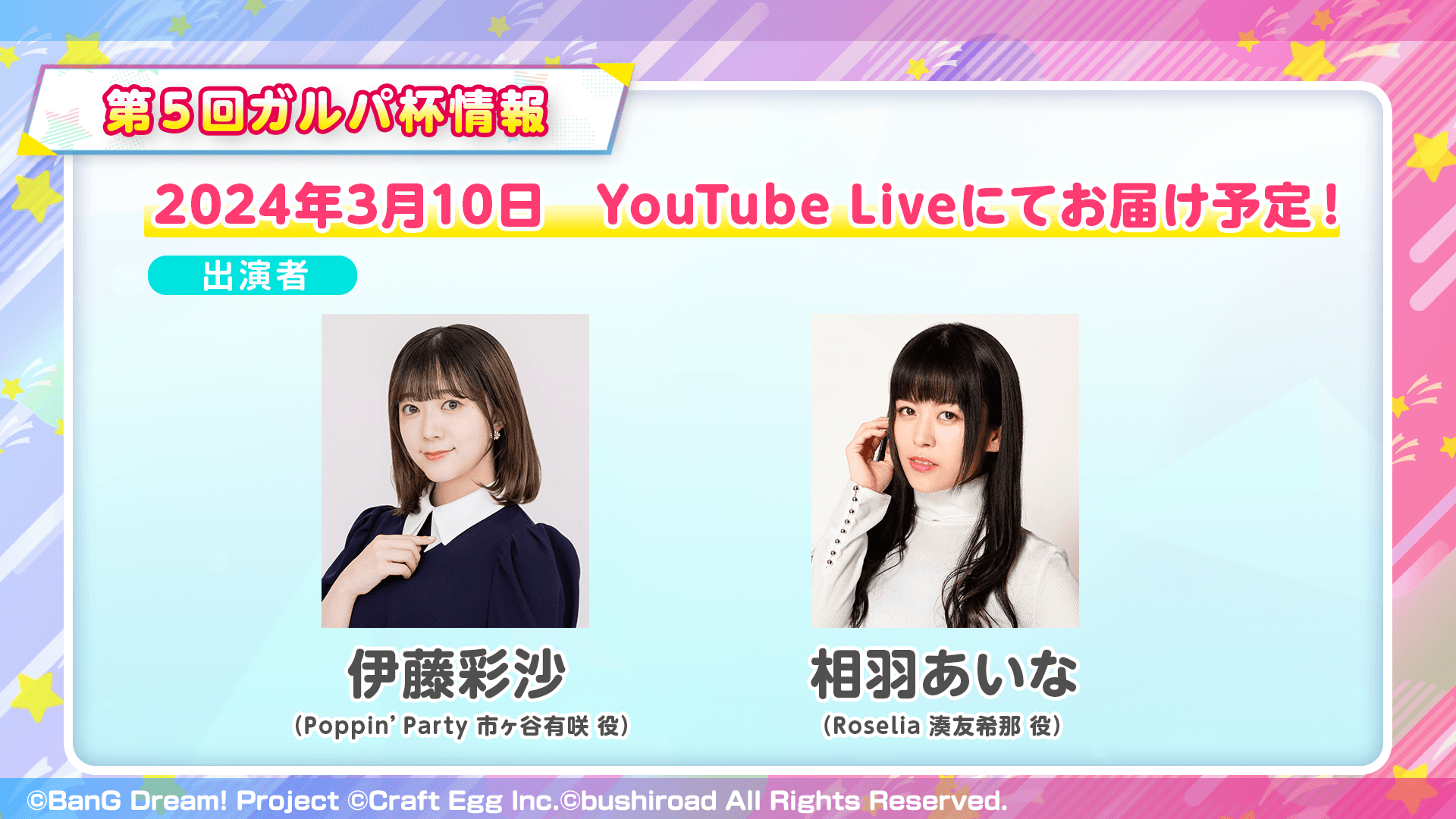 第5回ガルパ杯は2024年3月10日に開催され、伊藤彩沙と相羽あいなが出演することも発表されました。各イベントの詳細は公式サイトで確認できます。