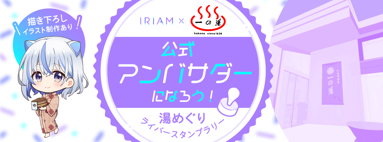 「IRIAM×一の湯 公式アンバサダーになろう!-湯めぐり ライバースタンプラリー-」は「IRIAMのVtuberを代表して一の湯の公式アンバサダーになろう!」がコンセプトのイベントです。イベント期間中に獲得したイベントポイントの総数でランキングを決定し、見事入賞を果たしたVtuberやVライバーは特典として、「公式アンバサダー」の就任、各施設に「等身大パネル」または「イラストパネル」の設置がされます。さらに、コラボ期間中は、3箇所以上でスタンプを集めると景品がもらえる、スタンプラリーも実施します。今回のコラボ施設は「塔ノ沢 一の湯本館」 「仙石原品の木一の湯」「箱根路開雲」 「仙石原ススキの原 一の湯」の4施設です。
