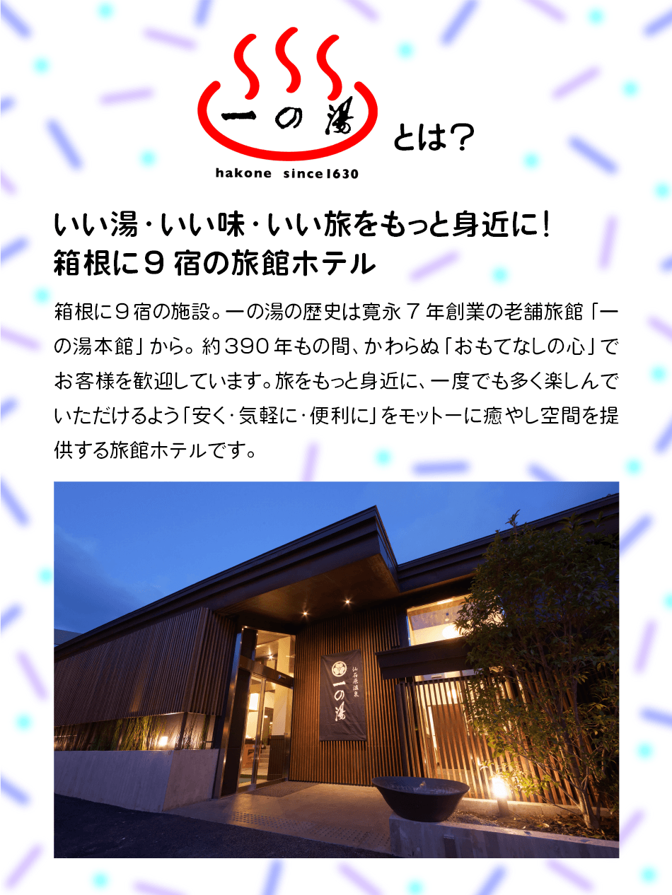 寛永7年創業の老舗温泉旅館「一の湯本館」を中心とし、現在箱根に9施設(箱根湯本、塔ノ沢、仙石原、芦ノ湖)の旅館とホテルを運営しています。「一つ先をゆく価値」、「革新と進化」によって「宿泊の常識を変え、宿泊によって日常生活の豊かさを提案する。」を経営理念に掲げており、常に人のため、社会貢献のためにお客様と共に前進して行きたいと全社一丸となって考えています。