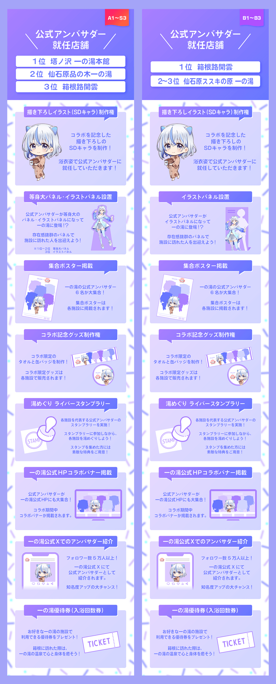 1〜2位:描き下ろしイラスト制作権(SDキャラ)・等身大パネル設置・集合ポスター掲載・コラボ記念グッズ制作権・湯めぐり ライバースタンプラリー・一の湯公式HPコラボバナー掲載・箱根一の湯公式Xでのアンバサダー紹介・一の湯優待券(入浴回数券)