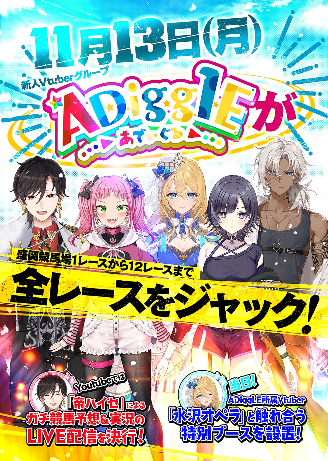 2023年10月23日に初配信デビューを果たした新規VtuberグループADiggLE(あでぃぐる)が、2023年11月13日(月)に盛岡競馬場の全12レースの冠名をジャック!