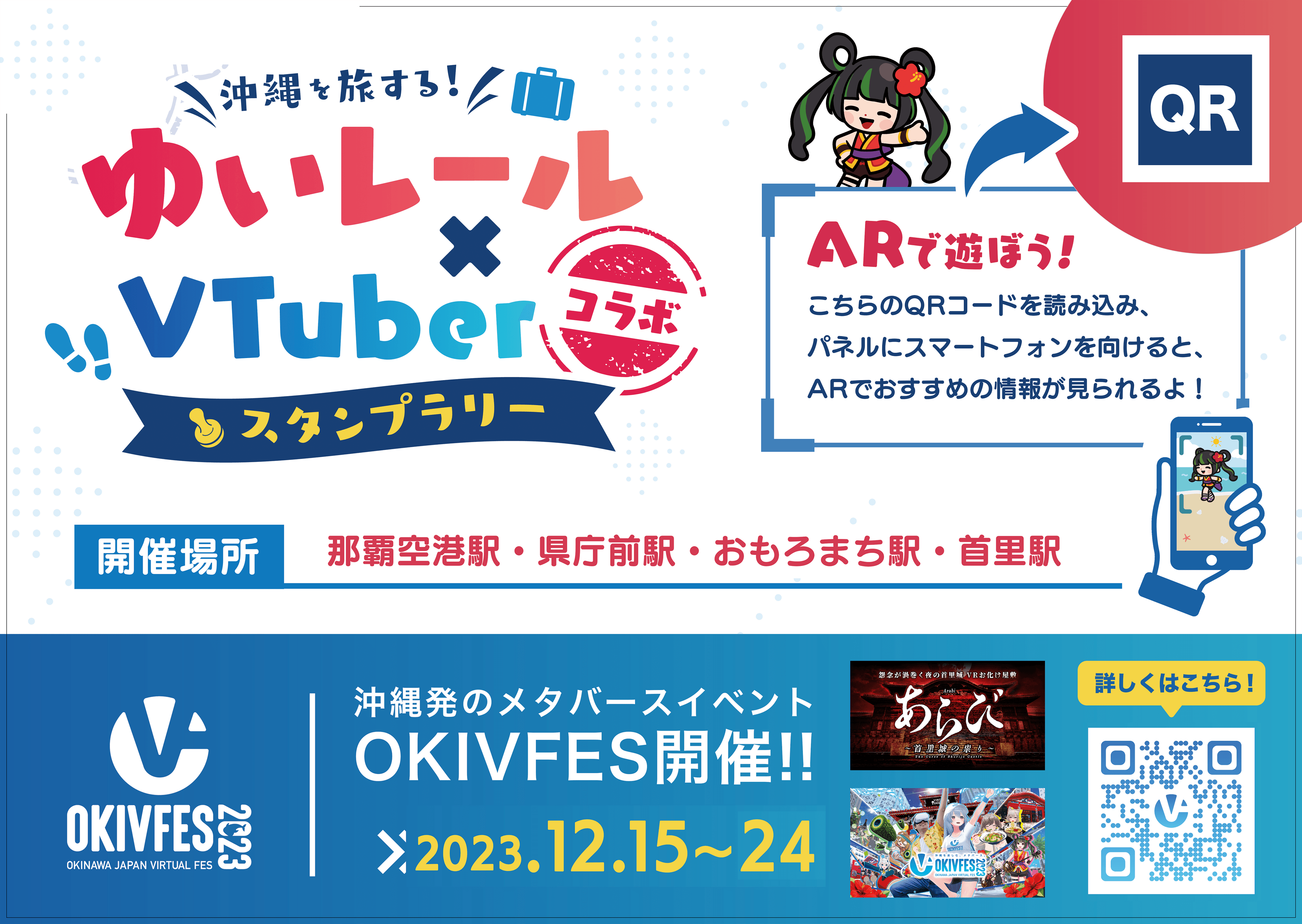 2023年11月17日(金)から12月24日(日)の期間、那覇空港駅、県庁前駅、おもろまち駅、首里駅に設置されたQRコードを読み取ると、沖縄ならではの衣装のVTuberとARで出会えます。
