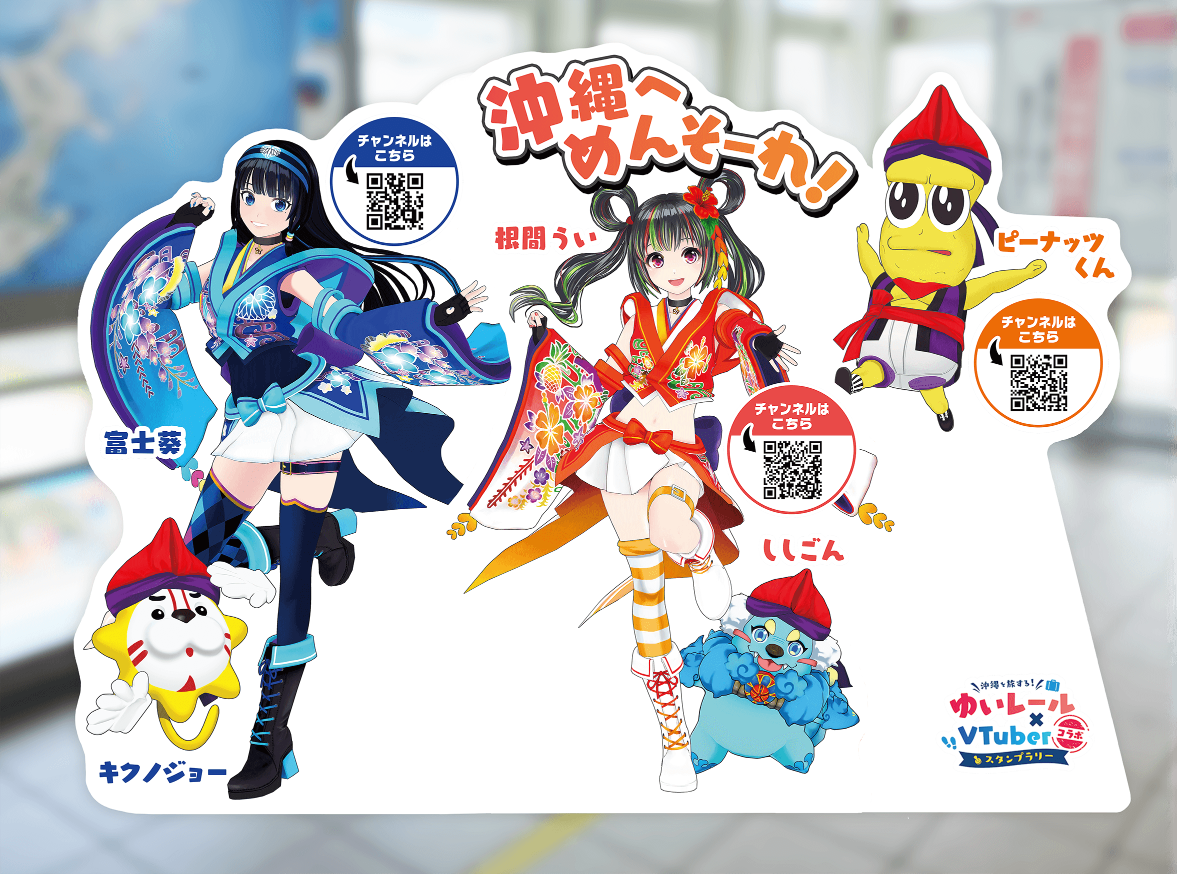 根間うい、ピーナッツくん、富士葵、キクノジョー、ししごんが登場し、沖縄の魅力やお得な情報を伝えてくれます。全駅のARを見てスタンプラリーを達成すると、特別なデジタル壁紙がもらえます。根間ういは2019年から沖縄の文化や観光を紹介するVTuberとして活動しています。