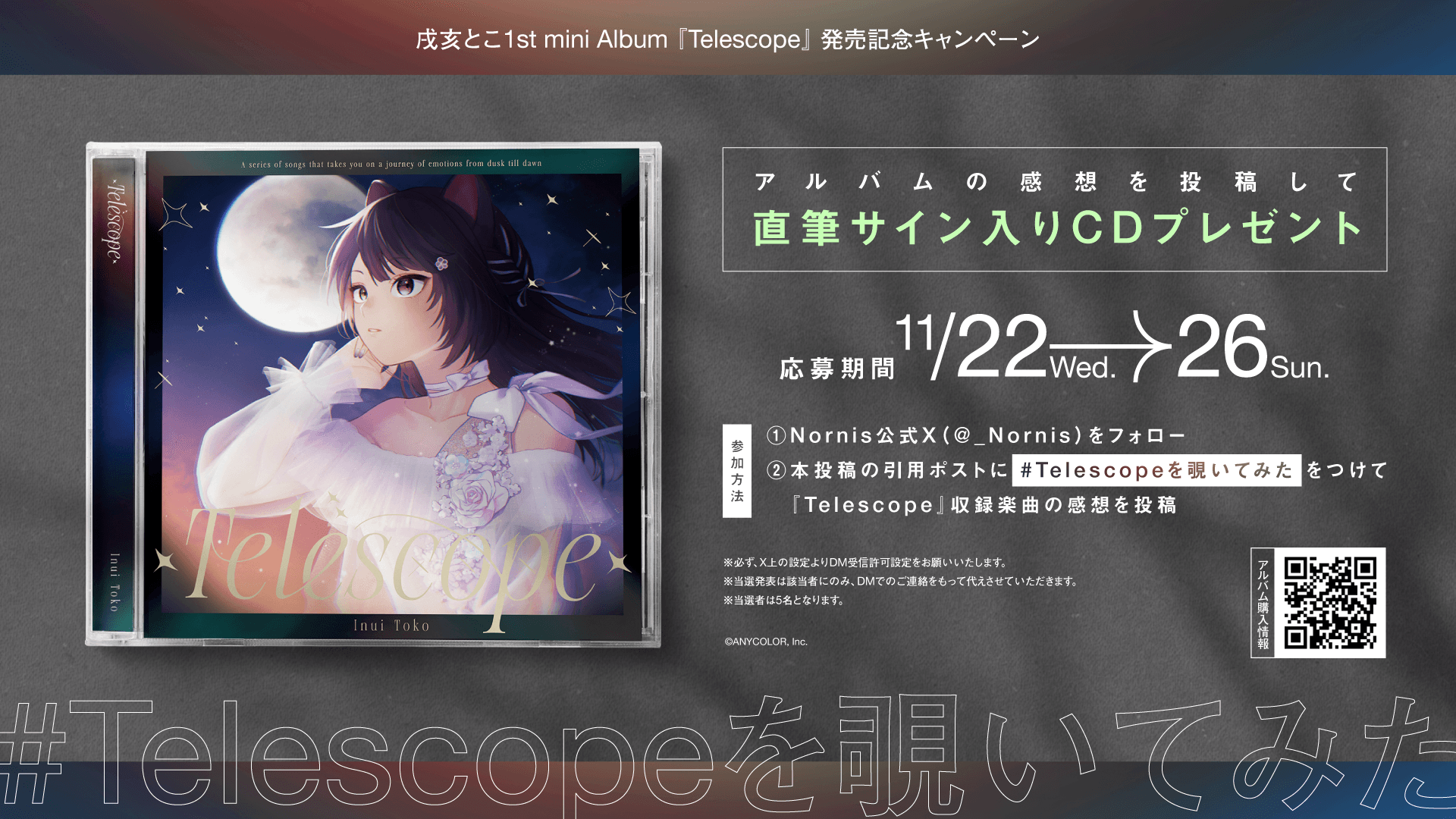 2023年11月22日(水)に発売するNornis戌亥とこ1st mini Album『Telescope』のデジタルリリースが決定いたしました!2023年11月22日(水)0:00より、各種配信プラットフォームにてデジタルリリースを開始いたします。