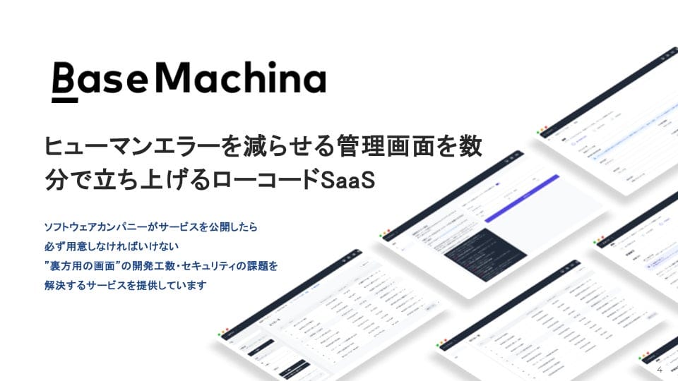 「BaseMachina」は、ヒューマンエラーを減らし、安全な管理画面を短時間で作成できるローコードSaaSです。