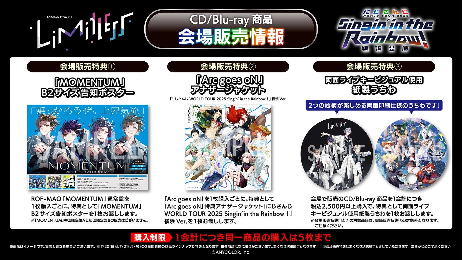 Kアリーナ横浜にて7月20日(日)と7月21日(月・祝)に開催される『ROF-MAO 2nd LIVE – Limitless』と『にじさんじ WORLD TOUR 2025 Singin’ in the Rainbow!横浜公演』会場でのにじさんじ関連CD/Blu-ray商品の販売が決定しました!