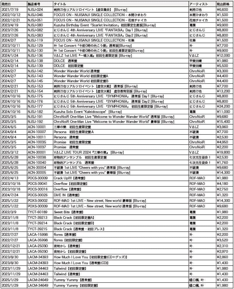 ANYCOLOR株式会社が運営するVTuberグループ「にじさんじ」は、7月20日(日)と21日(月・祝)にKアリーナ横浜で開催される『ROF-MAO 2nd LIVE – Limitless』および『にじさんじ WORLD TOUR 2025 Singin’ in the Rainbow! 横浜公演』にて、関連CD/Blu-ray商品の会場販売を実施するとのことです。