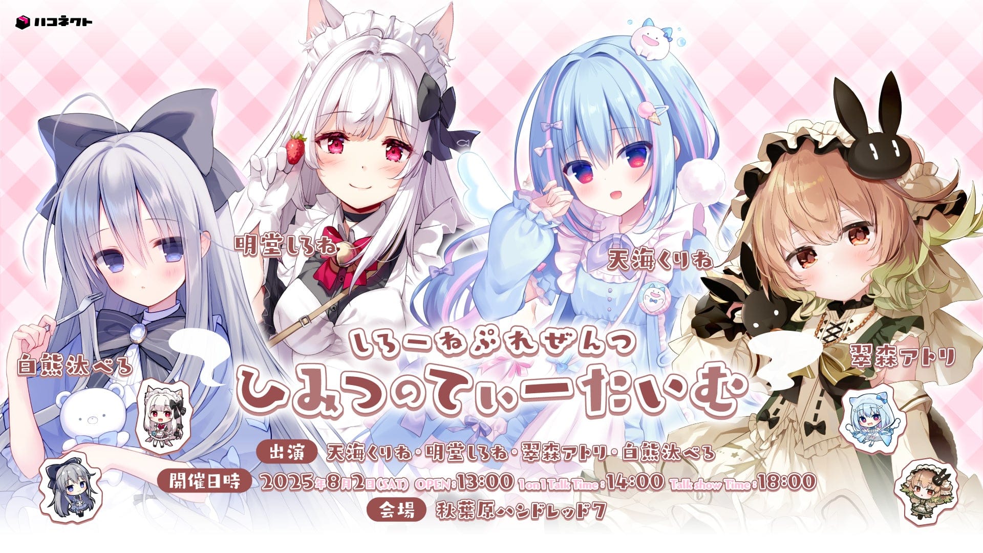 VTuber事務所「ハコネクト」を運営する株式会社アナログは、所属VTuber「明堂しろね」主催のイベント『しろーねぷれぜんつ ひみつのてぃーたいむ』の開催を発表しました。2025年8月2日に秋葉原ハンドレッド7で行われ、2部制で実施されるとのことです。