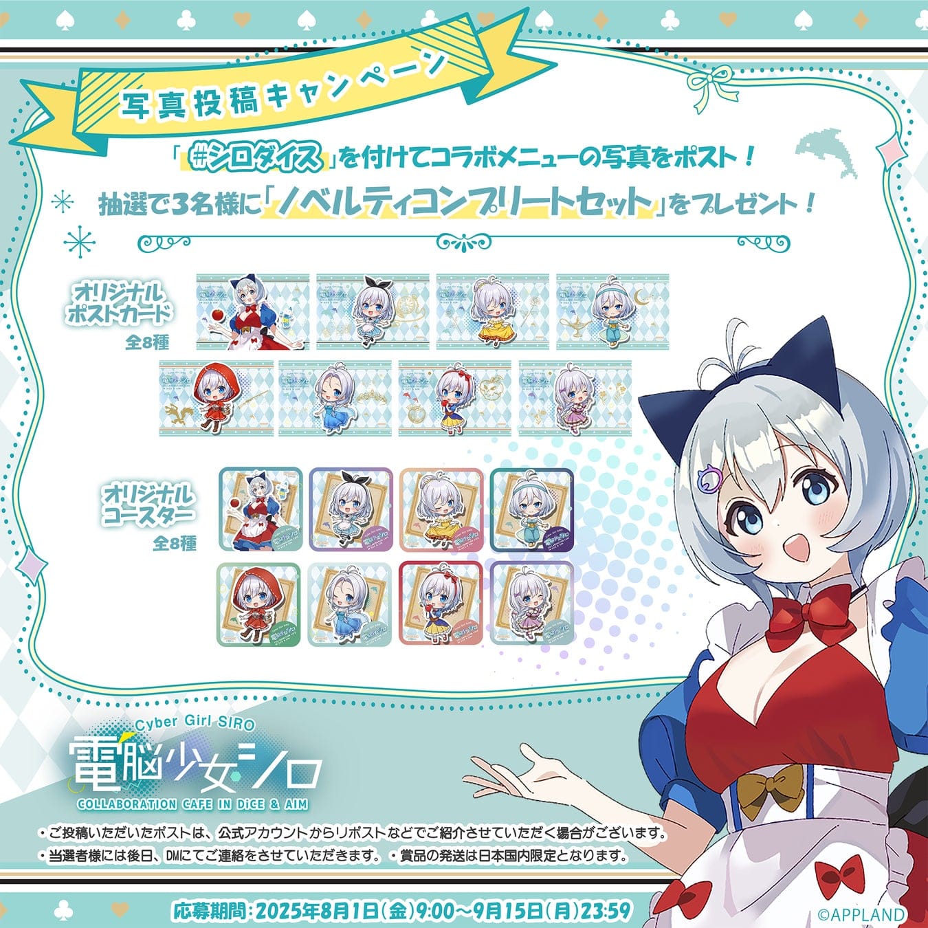 ハッシュタグ「#シロダイス」を付けてコラボフードの写真を投稿すると、抽選で3名様に「ポストカード&コースター全種セット」をプレゼント!
