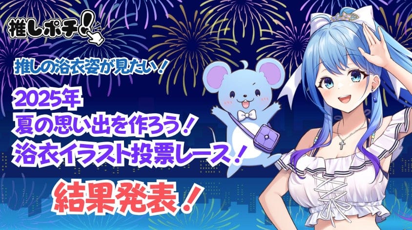 NTTドコモグループの「docomo STARTUP™」からスピンアウトしたCrossVisionが、リスナー参加型投票サイト「推しポチ!」で実施した「2025年 夏の思い出を作ろう 浴衣イラスト投票レース!」の結果を発表したとのこと。VTuberによる浴衣イラストの人気投票で、水乃あまねが1位を獲得し、10票お礼ボイスやブーストメダルボイスを提供する予定だそうだ。