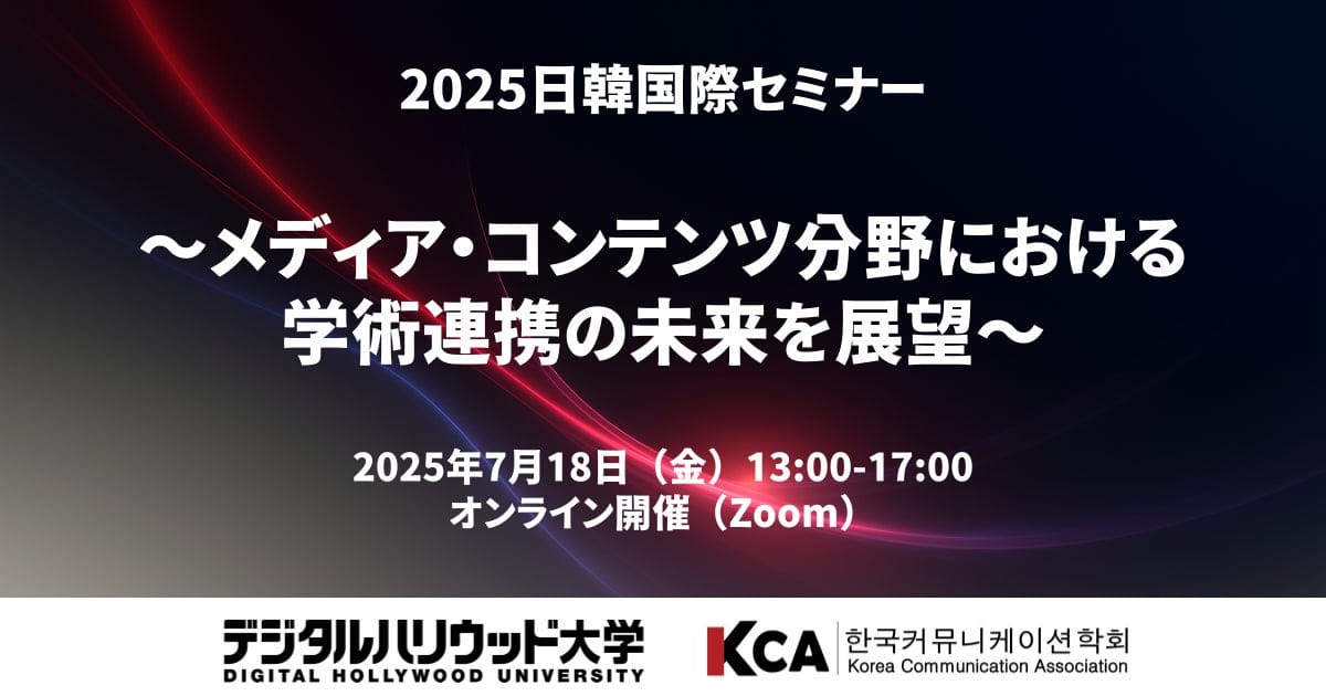文部科学省認可の株式会社立の大学として、デジタルコンテンツと企画・コミュニケーションを学ぶデジタルコミュニケーション学部(4年制大学)と、理論と実務を架橋し新たなビジネスを生み出すデジタルコンテンツ研究科(専門職大学院)を設置するデジタルハリウッド大学(DHU、所在地:東京・御茶ノ水、学長:杉山知之)は、韓国の主要学会である韓国コミュニケーション学会(Korean Communication Association)と共催で、日韓両国のメディア・コンテンツ分野の展望について考える「2025日韓国際セミナー」を2025年7月18日(金)にオンラインにて開催いたします。