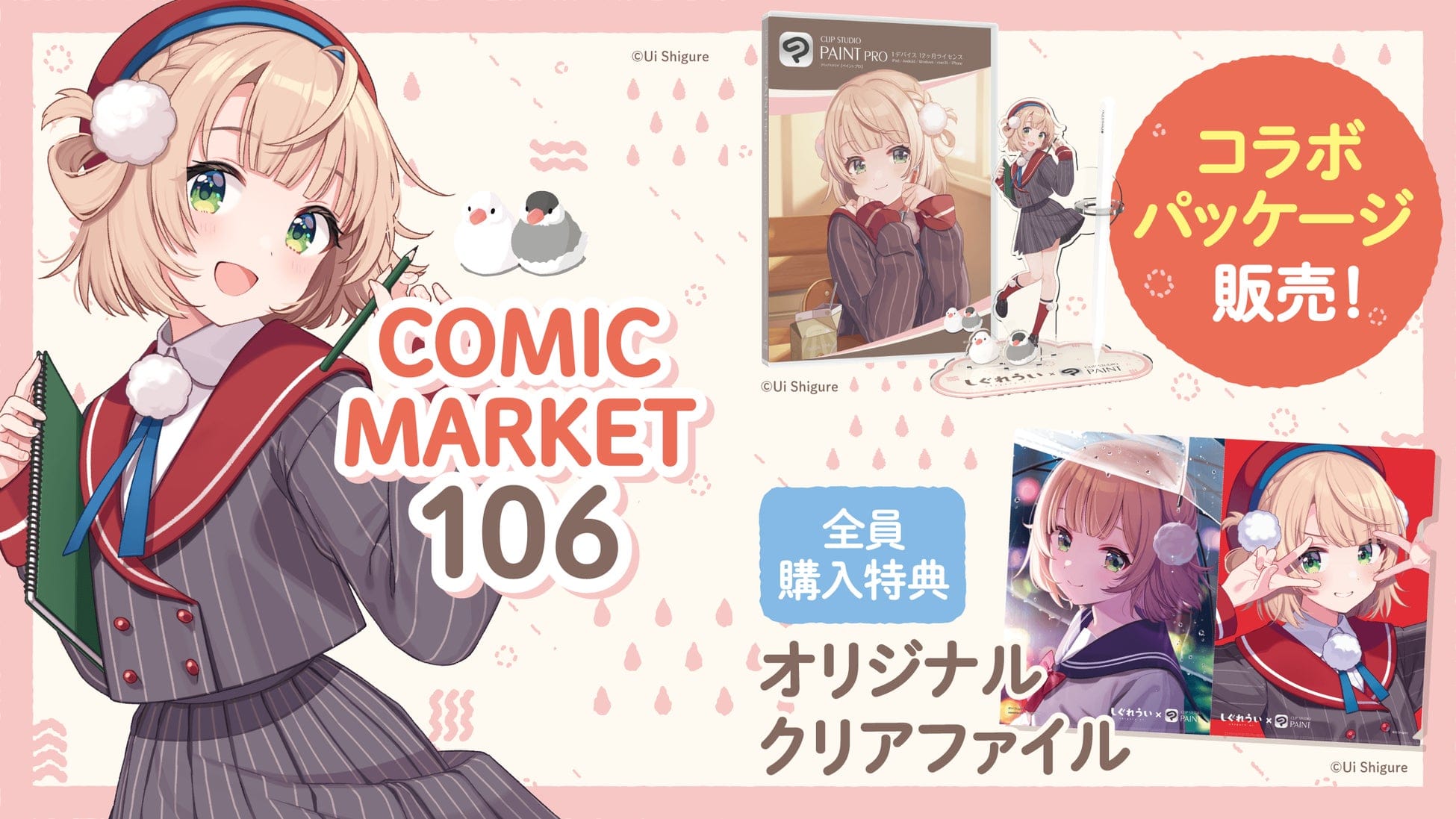 「C106限定クリエイター応援キャンペーン」では、しぐれうい先生とのコラボレーションによる「CLIP STUDIO PAINT PRO 1デバイスプラン12ヶ月版 オリジナルアクリルペンスタンド付き コラボパッケージ」を会場特典付きで販売します。その他、会場限定特価の「CLIP STUDIO TABMATE」のアウトレットセールや、CLIP STUDIO PAINTと液晶ペンタブレットのお得なセットなどを販売します。(*1)
