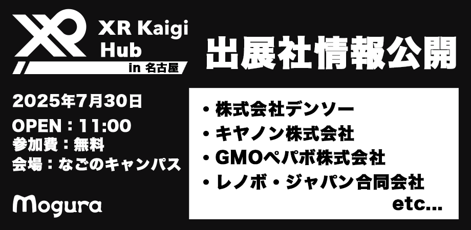 株式会社Moguraは、国内最大級のXRカンファレンス「XR Kaigi」の姉妹イベントとして7月30日(水)に開催する「XR Kaigi Hub in 名古屋」のセッション情報を発表いたしました。