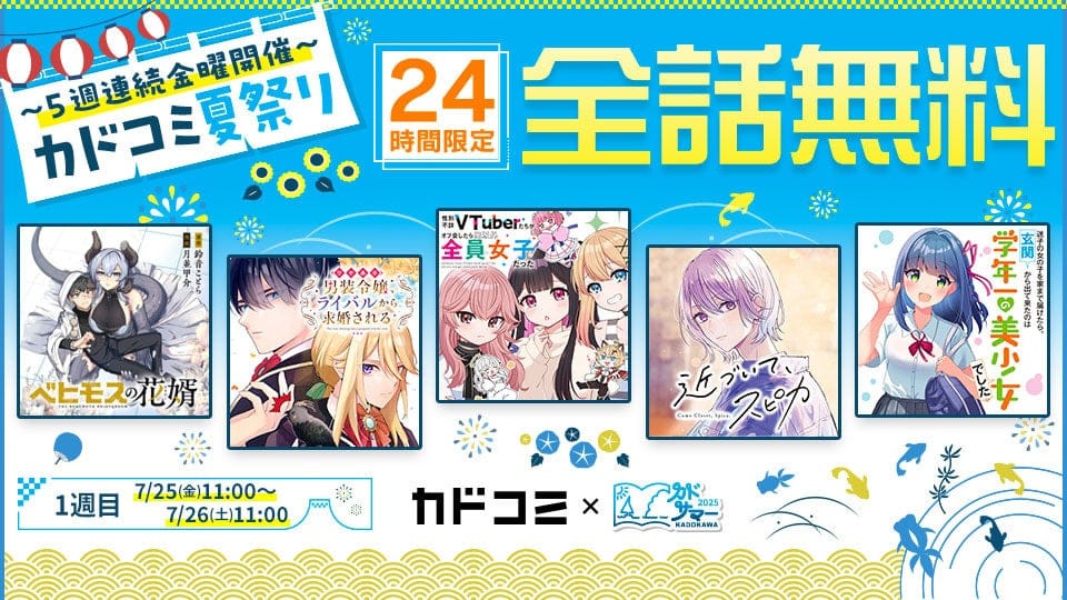 KADOKAWAとドワンゴが運営する「カドコミ」が、2025年7月25日から5週連続で全話無料企画「カドコミ夏祭り」を実施すると告知しています。