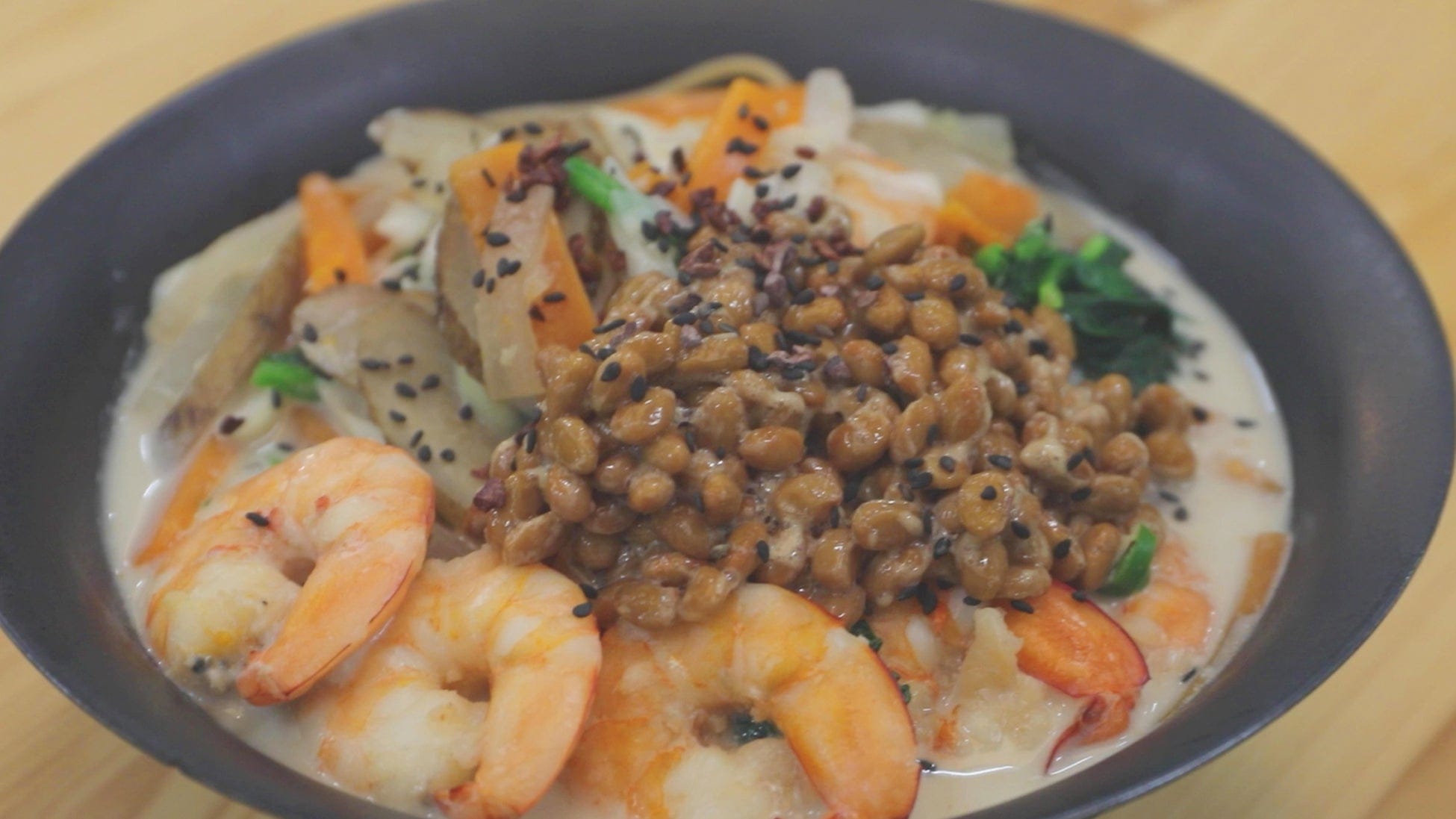 シェフのヒカルによれば、納豆の「プロバイオティクス効果」で腸内環境を整え、善玉菌を増やし、悪玉菌を減らすことができる「罪悪感のない」夜遅くのラーメン、とのだそうですが…