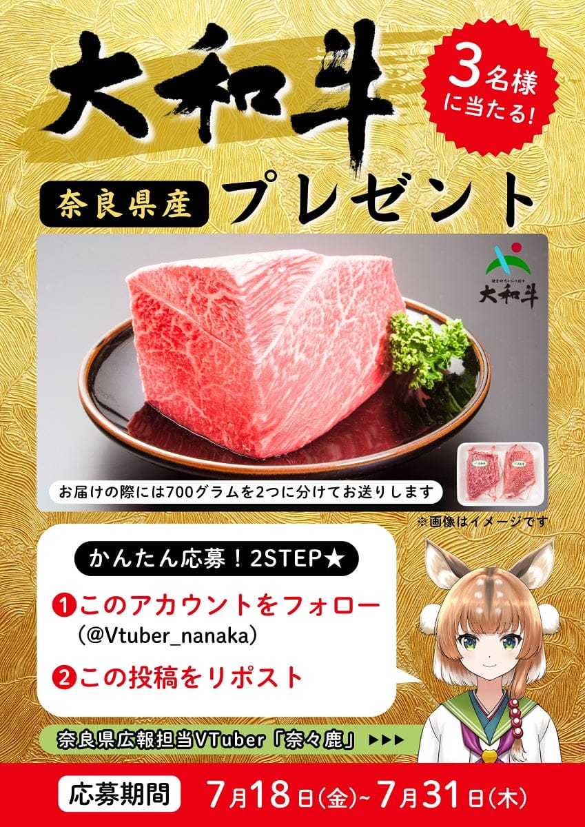 奈良県の広報担当VTuber「奈々鹿(ななか)」の公式X(旧Twitter)アカウントを使ったプレゼント企画「奈々鹿から皆さまへ!奈良の魅力をおすそわけキャンペーン!」が2025年7月18日にスタートしたとのこと。第1弾では、ブランド和牛「大和牛(700g)」が抽選で3名に贈られる予定だ。