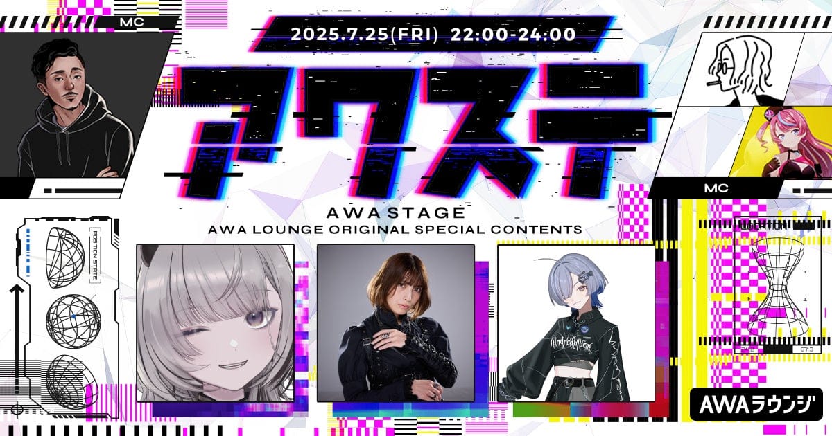AWA株式会社(本社:東京都港区、代表取締役CEO:冨樫晃己)が運営する、サブスクリプション型(定額制)音楽ストリーミングサービス「AWA(アワ)」は、2025年7月25日(金) 22:00より、無料で誰でも参加できるオンライン空間「ラウンジ」で、ネットシーンを中心とした注目アーティストなどを毎回ゲストに招き、有識者であるMCとともにシーンの次のステージを切り開く番組「AWAステージ(通称:アワステ)」の第55回を開催いたします。
