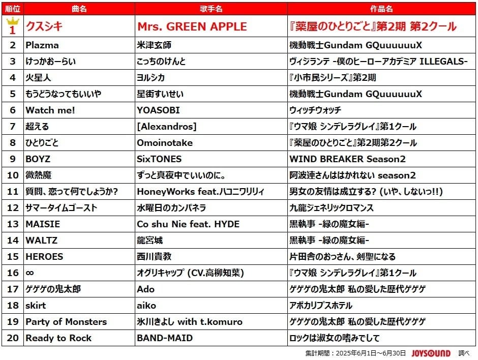 今シーズンのアニメ主題歌で最も多く歌われたのは、Mrs. GREEN APPLEによるTVアニメ『薬屋のひとりごと』第2期 第2クールのオープニングテーマ「クスシキ」。4月にリリースされたばかりの新曲ながら、2025年発売曲の中でカラオケ総合ランキング5位に入るなど、上半期を代表するヒットソングとなっています。