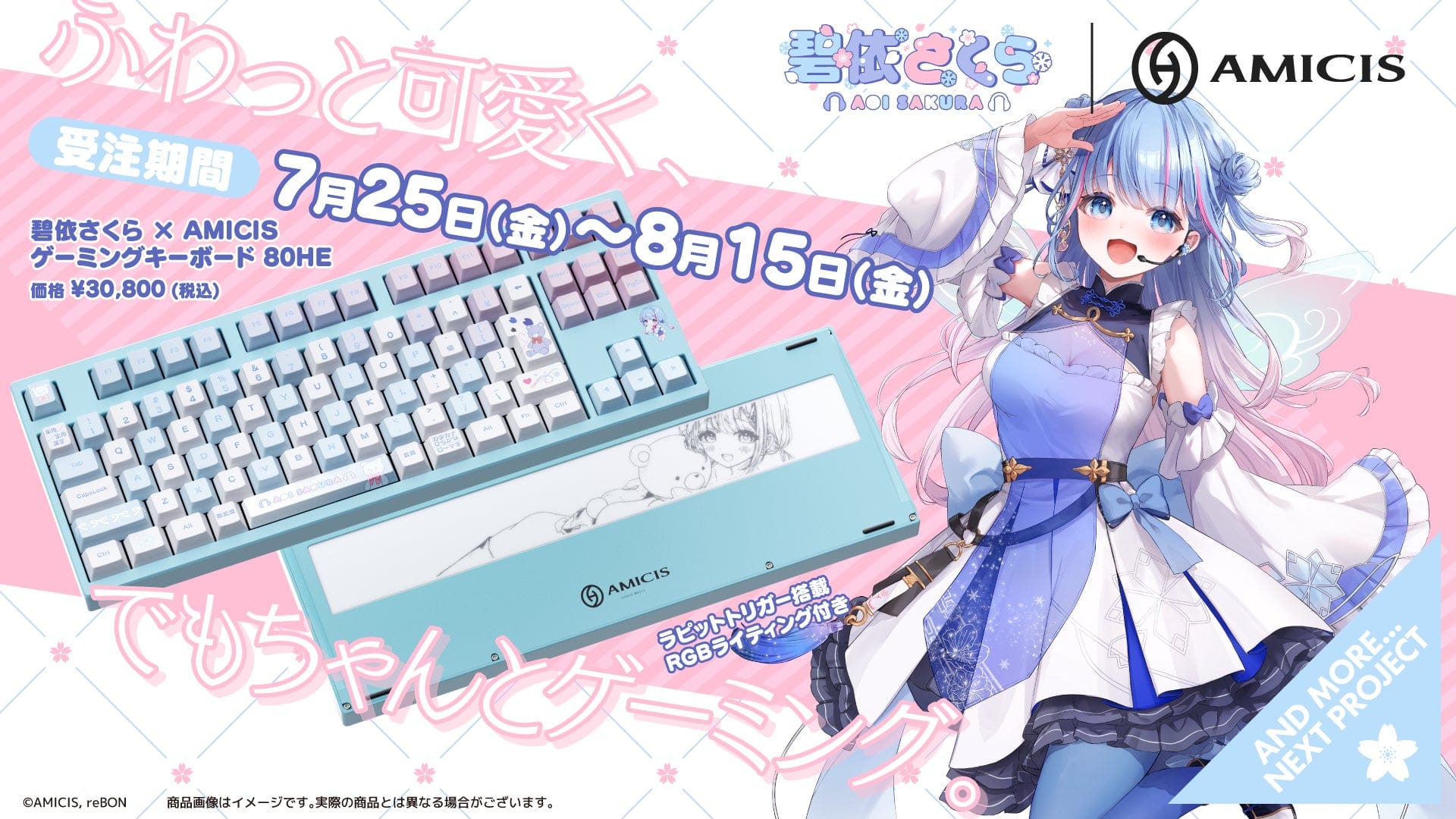 株式会社Game & Co.(本社:東京都港区、代表取締役:星 崇祥、読み:ゲームアンドコー、株式会社Brave group100%子会社、以下「Game & Co.」)が展開する「AMICIS (アミシス)」は、「碧依さくら 限定コラボデバイス」の第一弾として、オリジナルキーボードを2025年7月25日(金)〜8月15日(金)の期間限定で受注販売いたします。