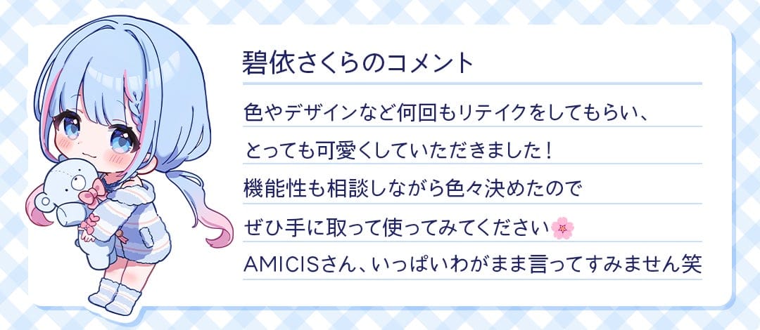 本製品はVTuberの碧依さくらさん自身がプロデュースした、AMICISとの限定コラボデバイスです。ふわっと可愛く、しっかりゲーミングユースに耐えるという特別仕様のゲーミングキーボードには、「桜の妖精と雪女のハーフ」という彼女のアイデンティティがぎゅっと詰め込まれています。