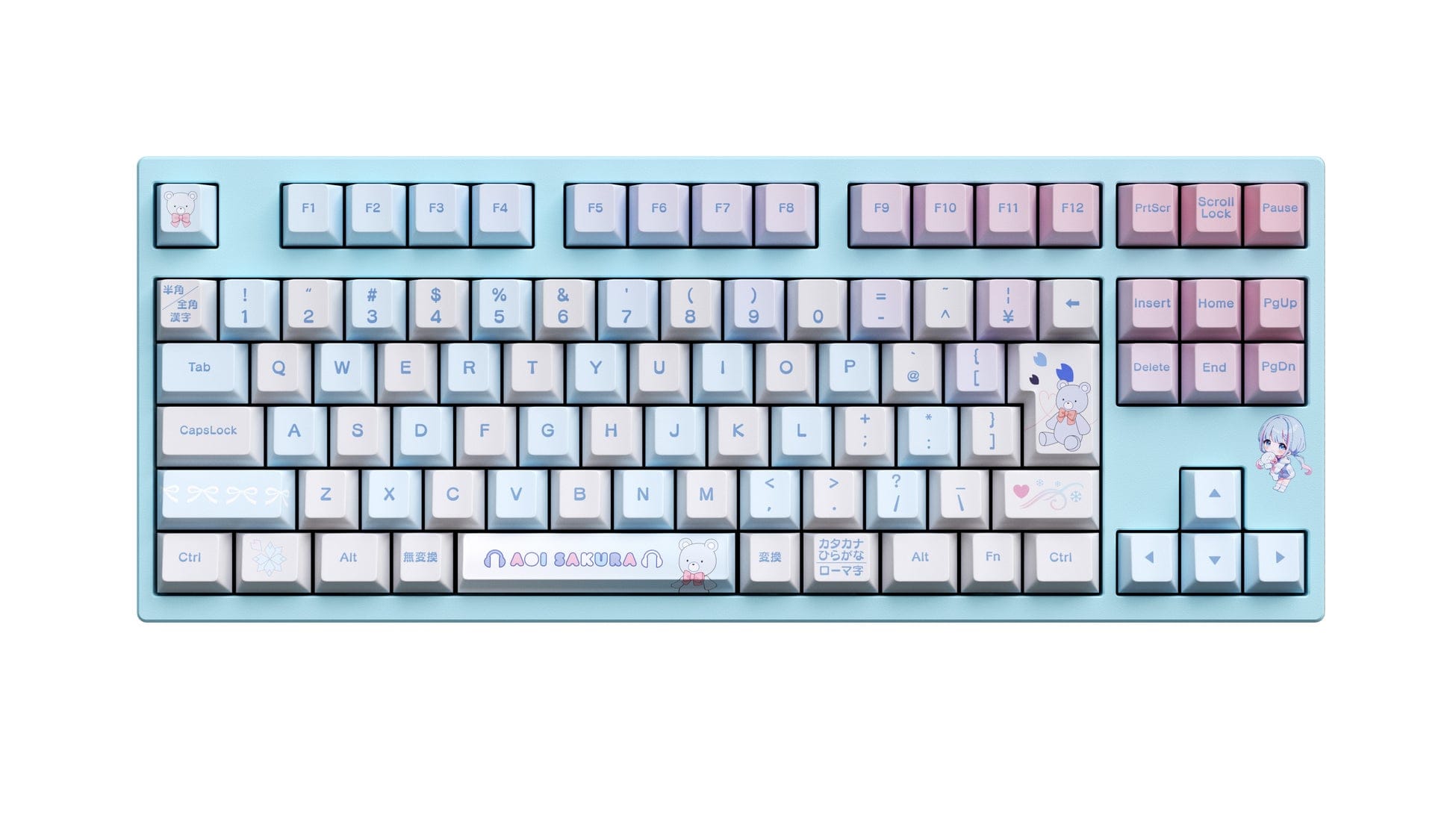 本体は水色・ピンク・白を基調とした「桜の妖精と雪女のハーフ」をテーマにしたデザインで、キャラクターデザイナーのみゃーなぎ先生による描き下ろしイラストをガラスプレートで背面に封入。Gateron White Maxスイッチや8Kポーリングレート対応USB-C接続など、ゲーミング仕様も押さえている。