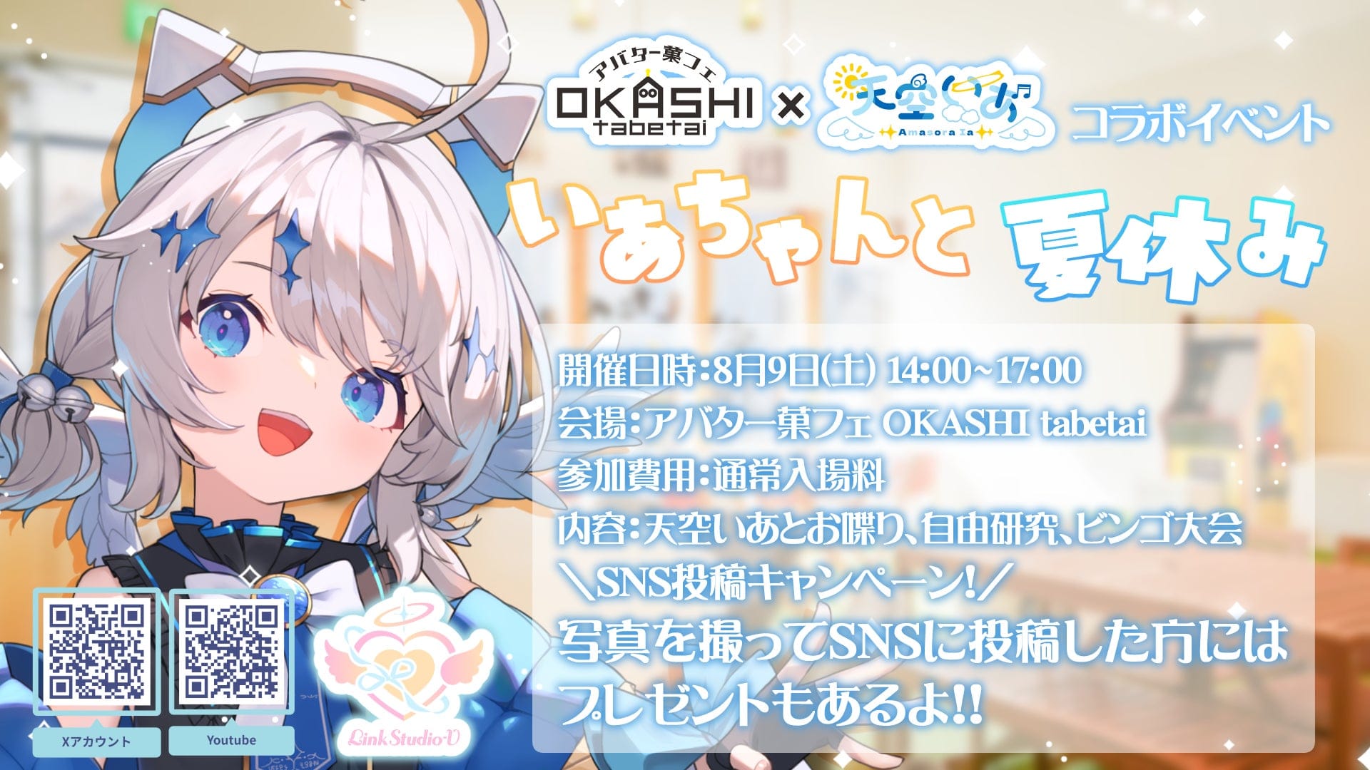 Link Studio-V所属の人気Vtuber「天空いあ」が、名古屋市北区にあるアバター接客型セルフカフェ「アバター菓フェ OKASHI tabetai」で、2025年8月9日(土)14時〜17時に「いあちゃんと夏休み」イベントを開催する。