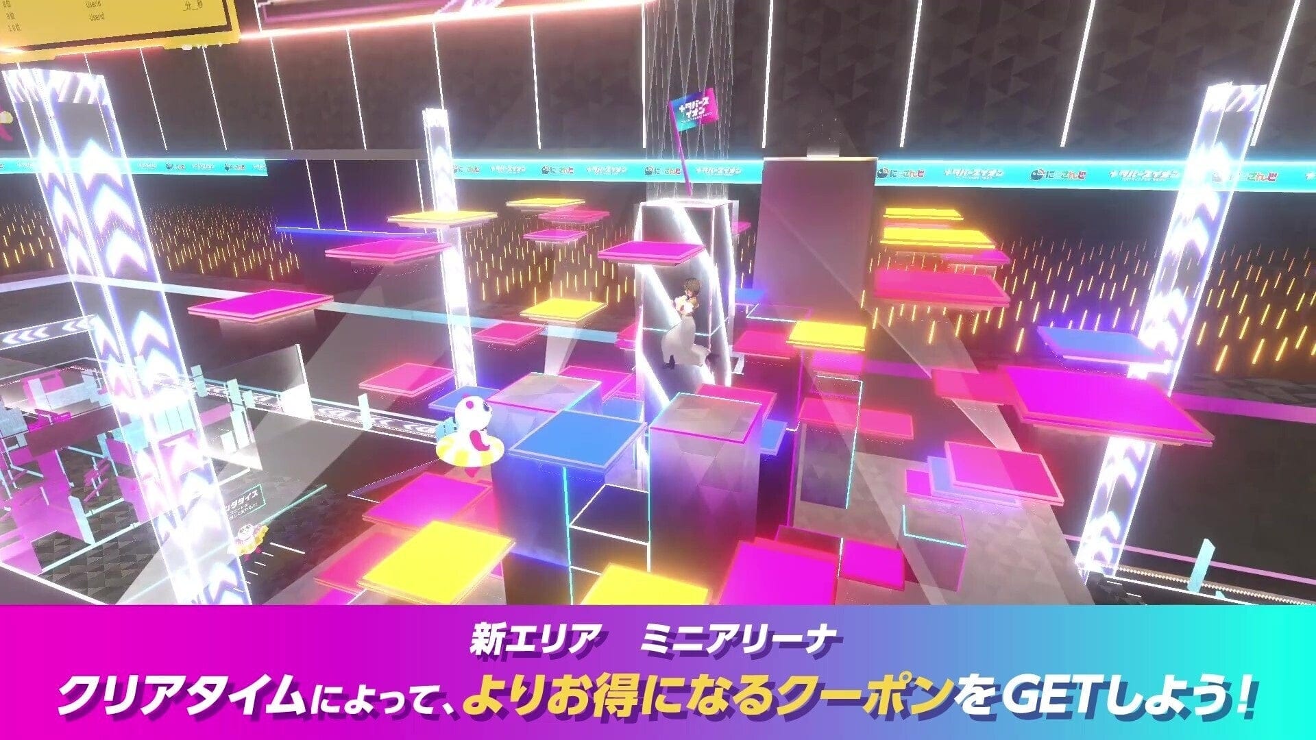 今回のメタバースイオンは、新作エリア「ミニアリーナ」を含む3つのワールドで構成されており、ゲームをクリアすることでECクーポンや限定バーチャルアクセサリーが獲得できる。