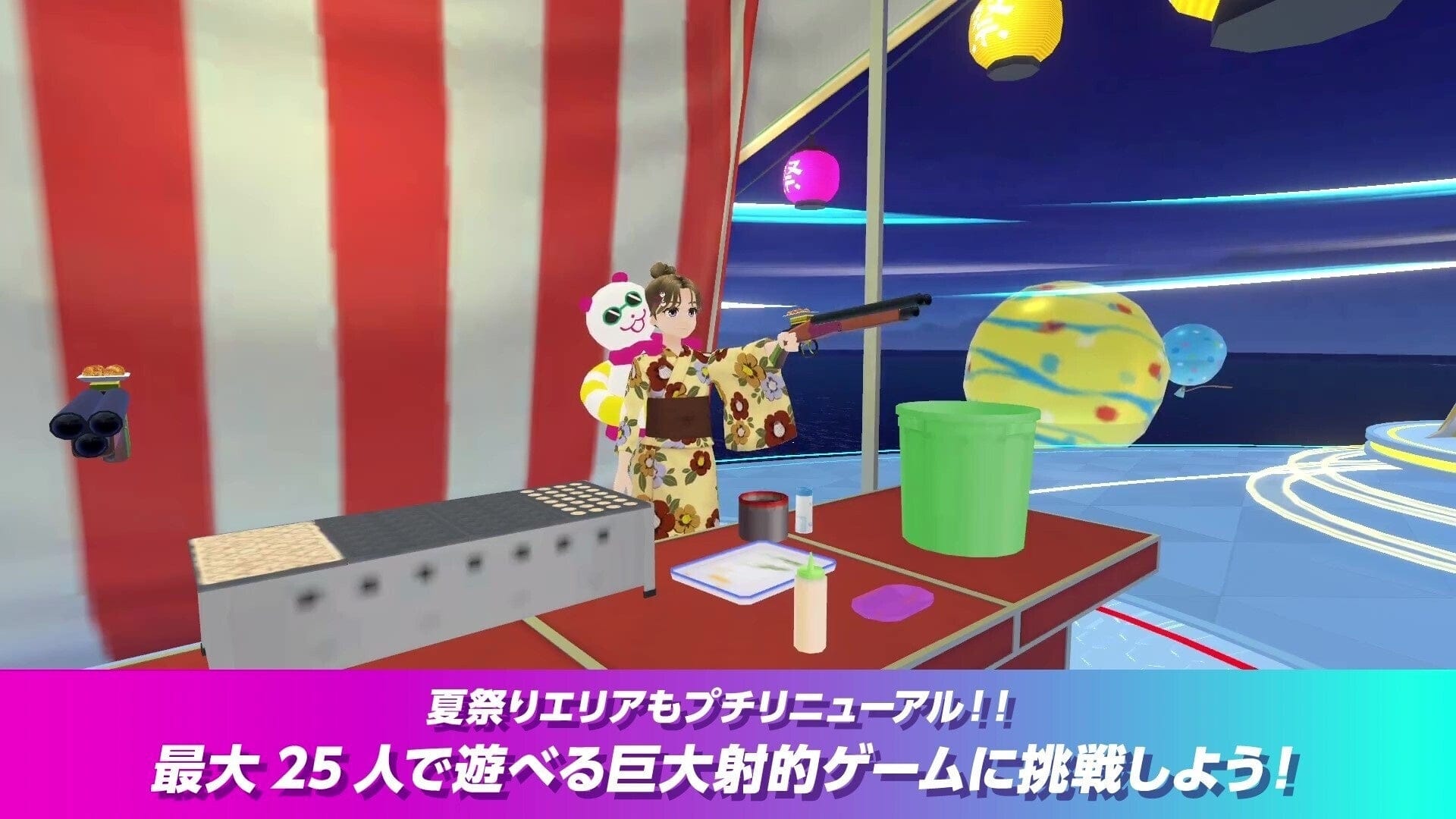 プチリニューアルした「夏祭りエリア」では、屋台がモチーフの5種類の射的銃を使って楽しむ「巨大射的ゲーム」が登場。最大25人が同時に遊ぶことも可能です。また日時限定ミッションの時間帯にチャレンジすることで限定バーチャルアクセサリーもGETできます!