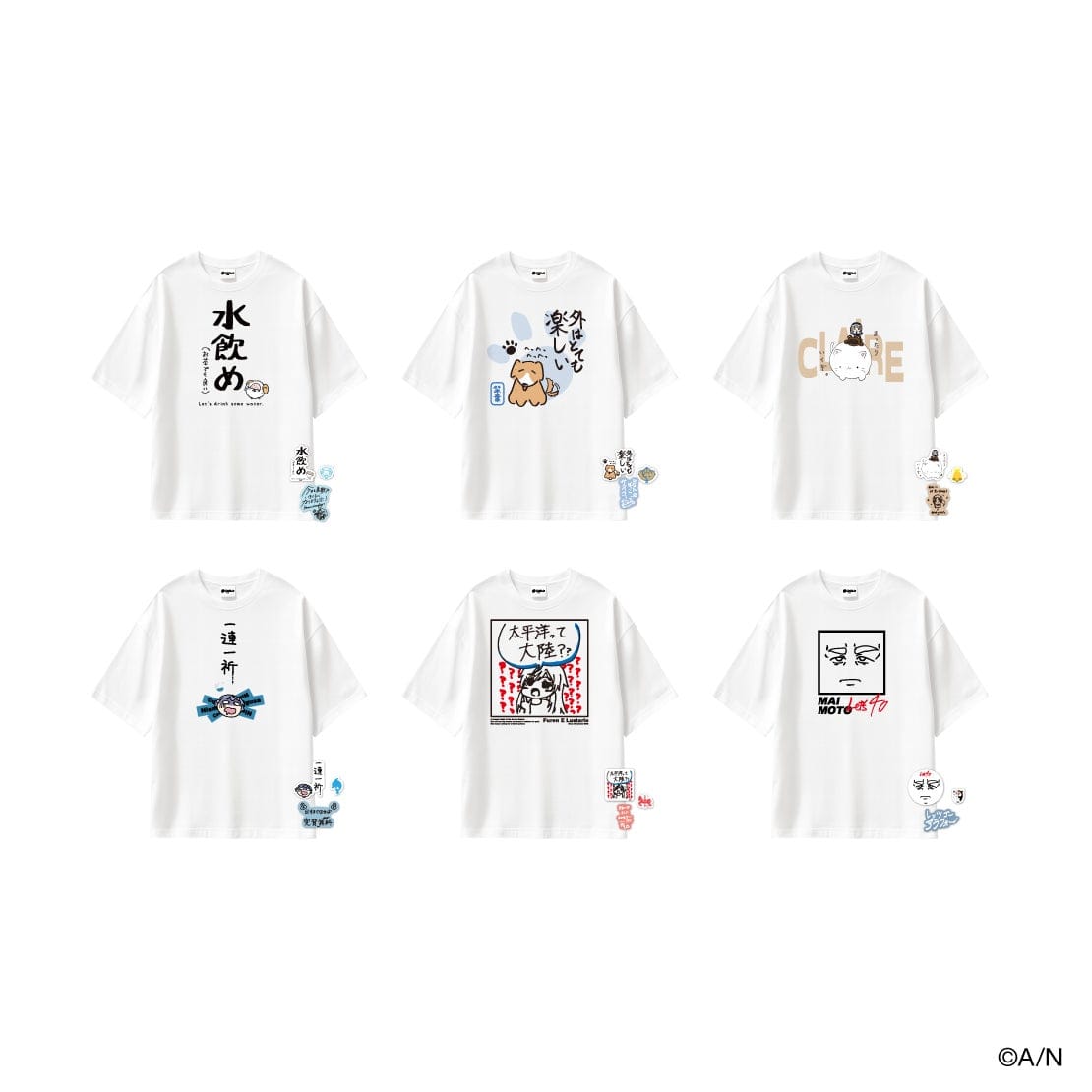 • 名言イラストTシャツ&ステッカーセット:各5,700円(税込)、全6種。Tシャツは綿素材、ステッカーは紙で、ステッカーは3枚セット。