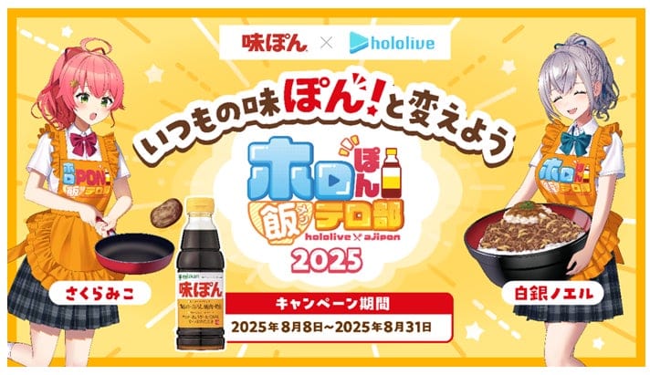 株式会社Mizkanは、「味ぽん」ブランドと女性VTuberグループ「ホロライブ」によるコラボ企画「ホロぽん飯テロ部 2025」を2025年8月8日(金)から期間限定で開始すると発表した。昨年に続く取り組みで、今年は通称「PON」として親しまれるさくらみこさんが新たに中心メンバーとして参加し、白銀ノエルさんとともに企画を盛り上げるとしている。昨年の取り組みはプレス資料で確認できる(昨年のキャンペーン内容)。