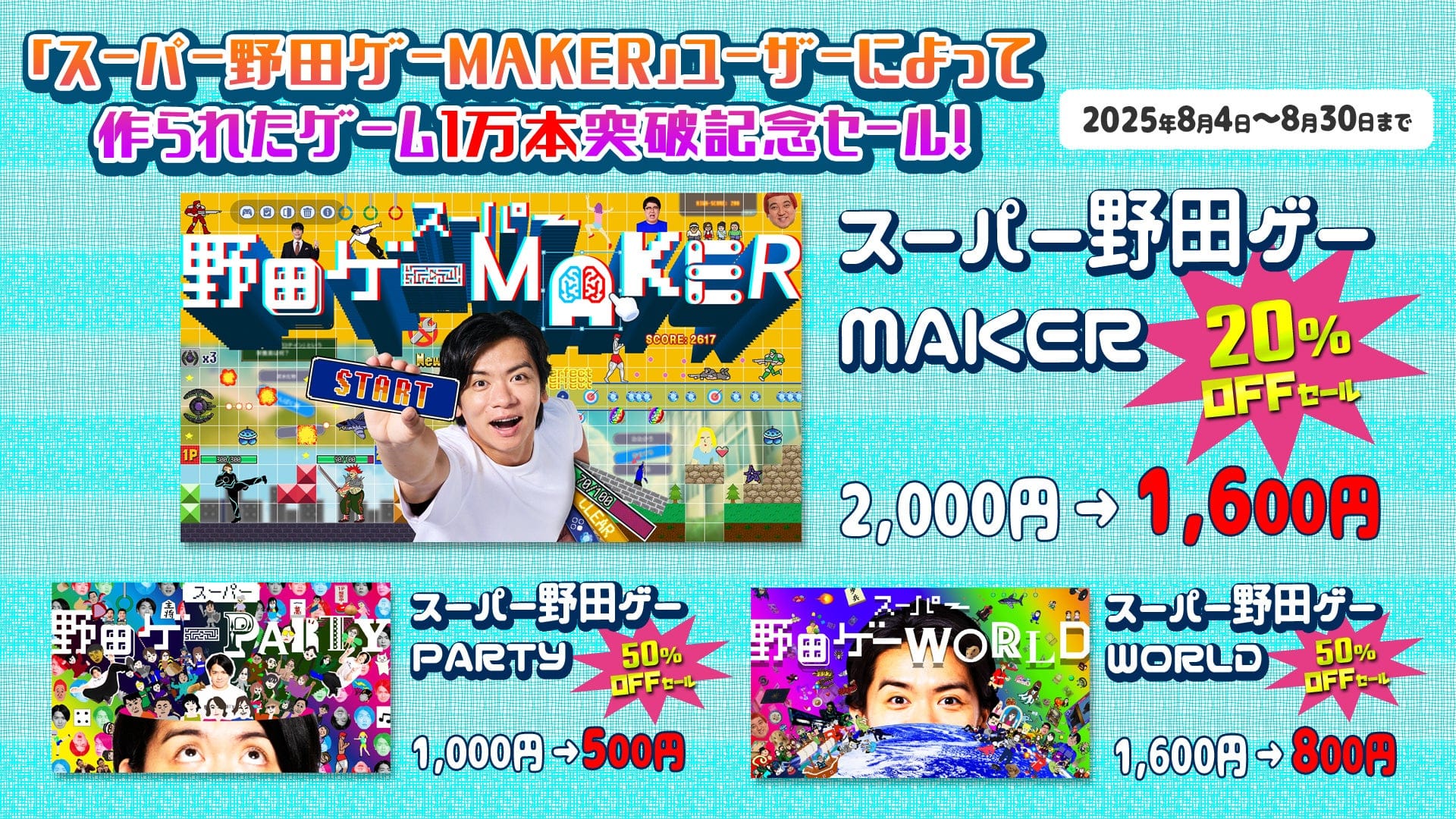 あわせて、ユーザー投稿ゲームが10,000本を突破したことを記念し、初のセールを開始。「スーパー野田ゲーMAKER」に加え、「スーパー野田ゲーPARTY」「スーパー野田ゲーWORLD」も50%オフとされ、期間は2025年8月4日(月)0:00〜8月30日(土)23:59。