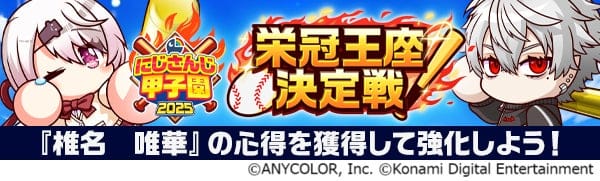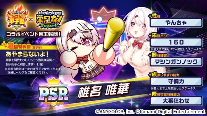 株式会社コナミデジタルエンタテインメントは、モバイルゲーム『パワフルプロ野球 栄冠ナイン クロスロード』において、「にじさんじ甲子園2025」応援キャンペーンを8月5日から開始したと発表した。VTuber/バーチャルライバープロジェクト「にじさんじ」から、同大会に出場した椎名唯華と葛葉がゲーム内に初登場する。また、7月25日から27日に行われた「にじさんじ甲子園2025」本戦および決勝の開催を記念し、豪華報酬が受け取れる各種企画が展開されるとしている。