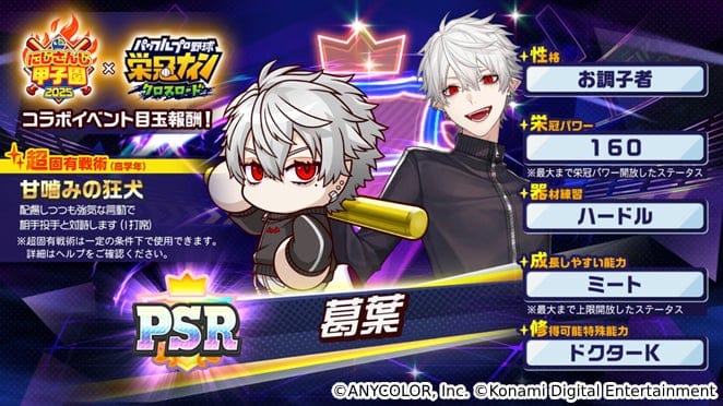株式会社コナミデジタルエンタテインメントは、モバイルゲーム『パワフルプロ野球 栄冠ナイン クロスロード』において、「にじさんじ甲子園2025」応援キャンペーンを8月5日から開始したと発表した。VTuber/バーチャルライバープロジェクト「にじさんじ」から、同大会に出場した椎名唯華と葛葉がゲーム内に初登場する。また、7月25日から27日に行われた「にじさんじ甲子園2025」本戦および決勝の開催を記念し、豪華報酬が受け取れる各種企画が展開されるとしている。