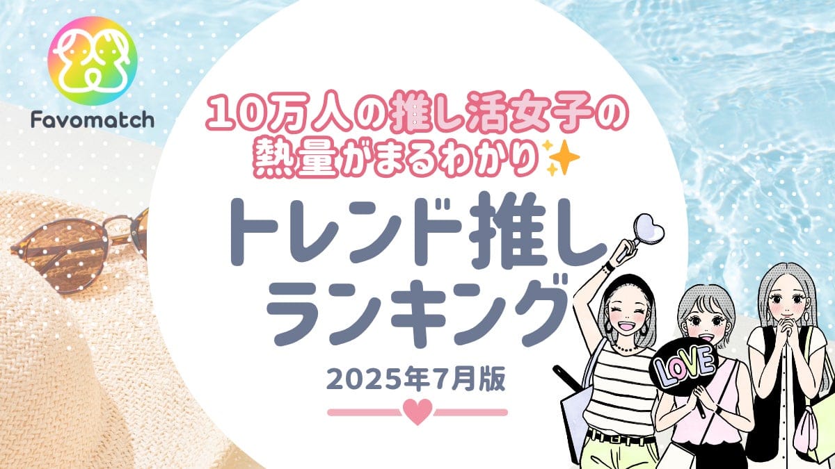 対象期間は2025年7月1日〜7月31日で、Favomatchアクティブユーザーの「推しリスト」「最推し」「推しメン・キャラ」登録を集計。主要ユーザー層は20代〜30代前半の女性。詳細データの提供やリサーチサービスにも対応するとしており、出典表記は「Favomatch(ファボマッチ)」およびhttps://favosia.jp/trend-ranking-202507/へのリンクが求められる。