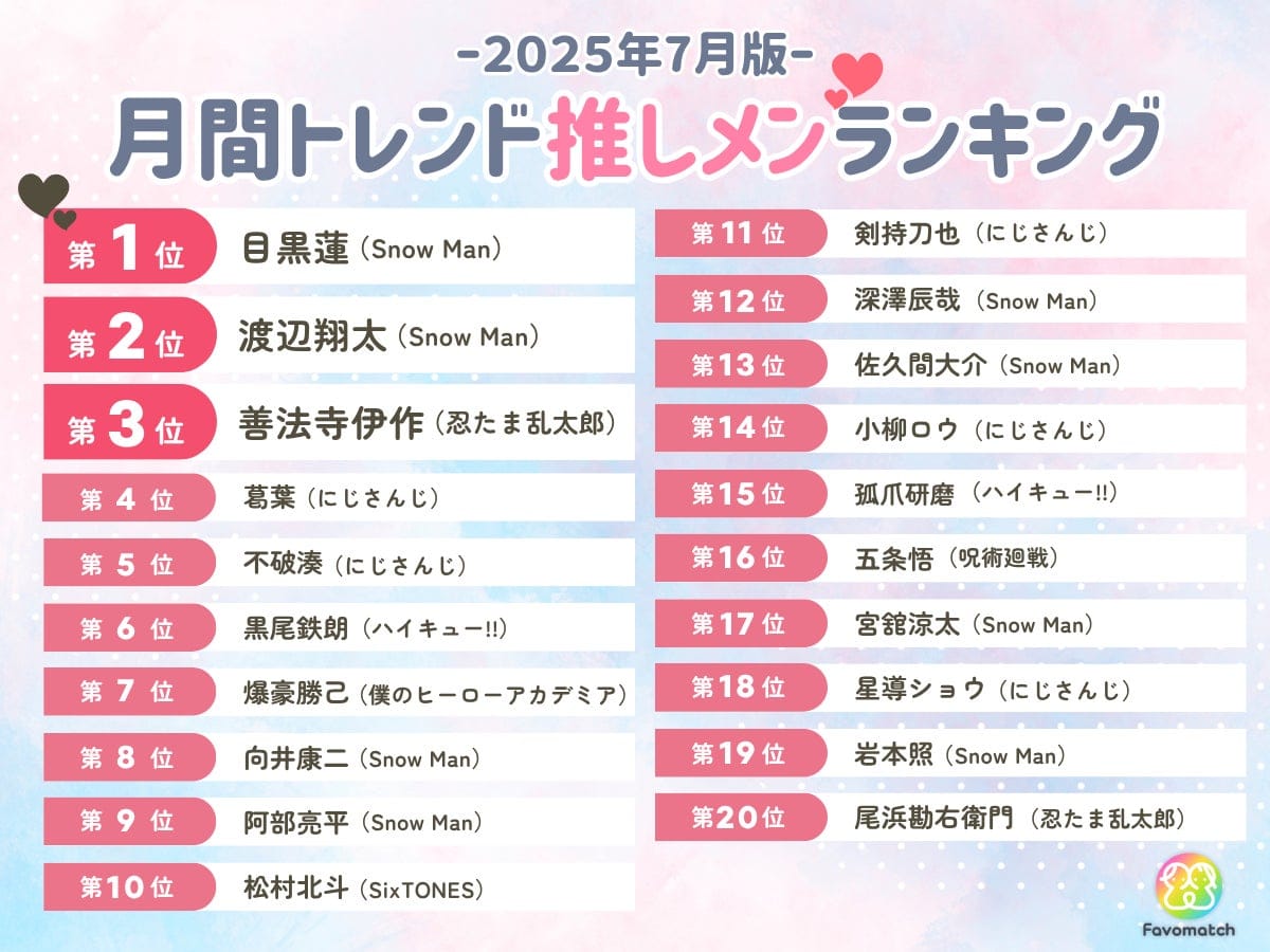 推し活アプリFavomatch(ファボマッチ)を運営する株式会社Favosia(本社:東京都港区、代表:浅埜菜美子)は、2025年7月にアプリ内で最も人気を集めたコンテンツやキャラクターをもとに、「月間トレンド推しランキング(総合/本命/推しメン)」を発表しました。